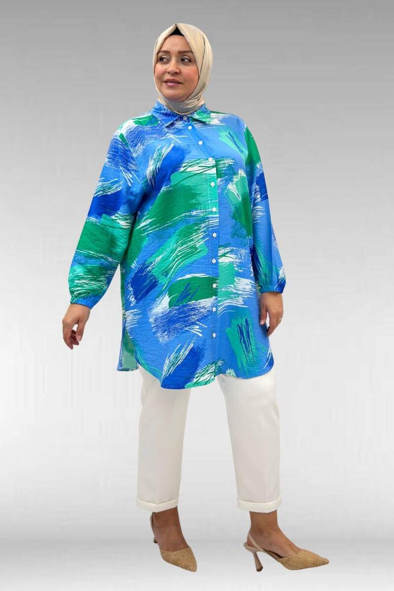 68010 Büyük Beden Yanları Yırtmaçlı Kolları Lastikli Mango Tunik - Desenli Mavi