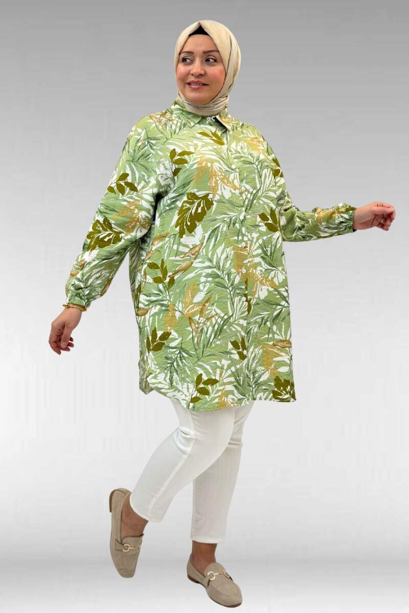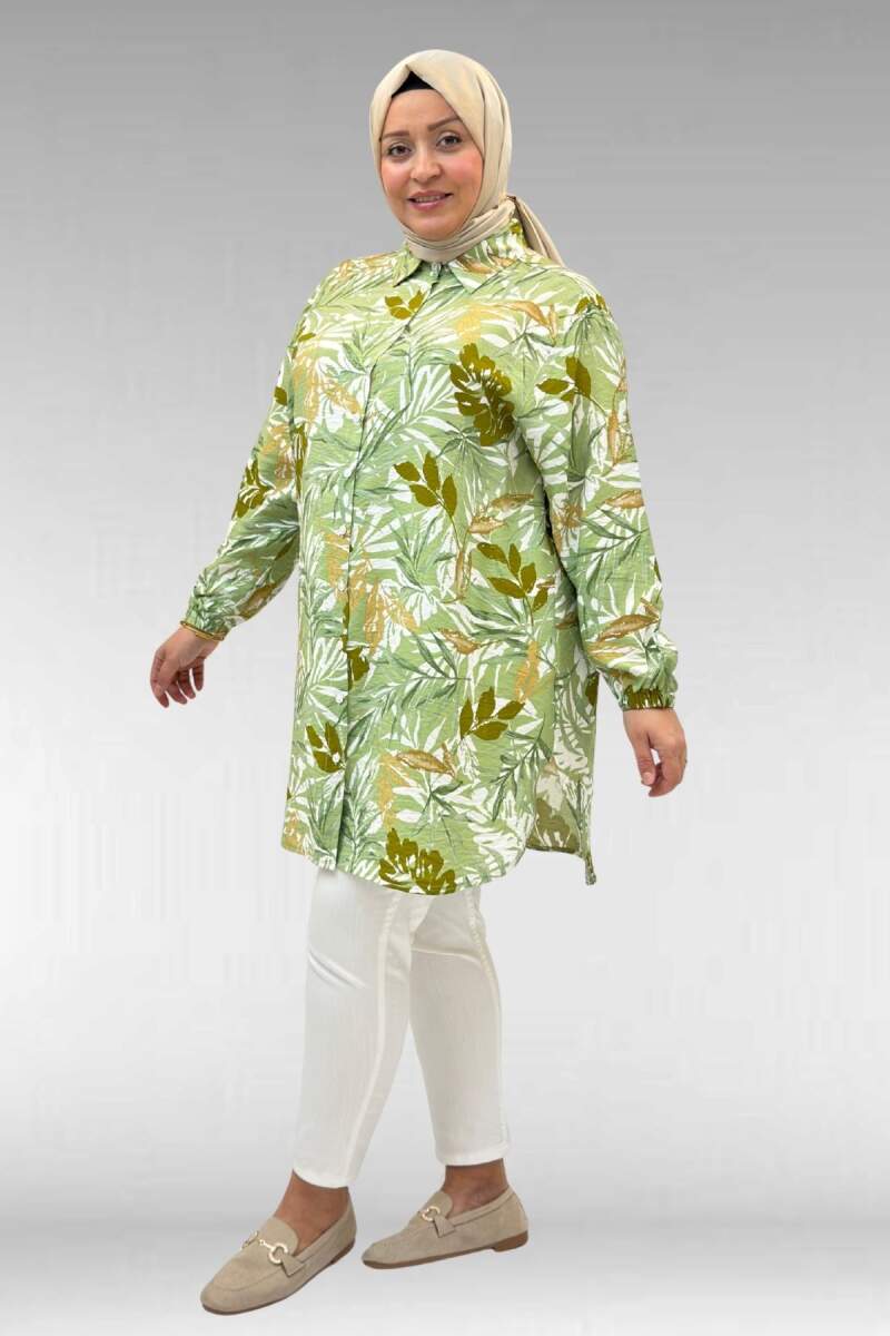 68010 Büyük Beden Yanları Yırtmaçlı Kolları Lastikli Mango Tunik - Yaprak Desen Vizon