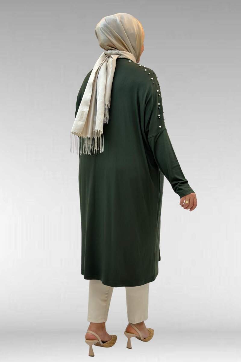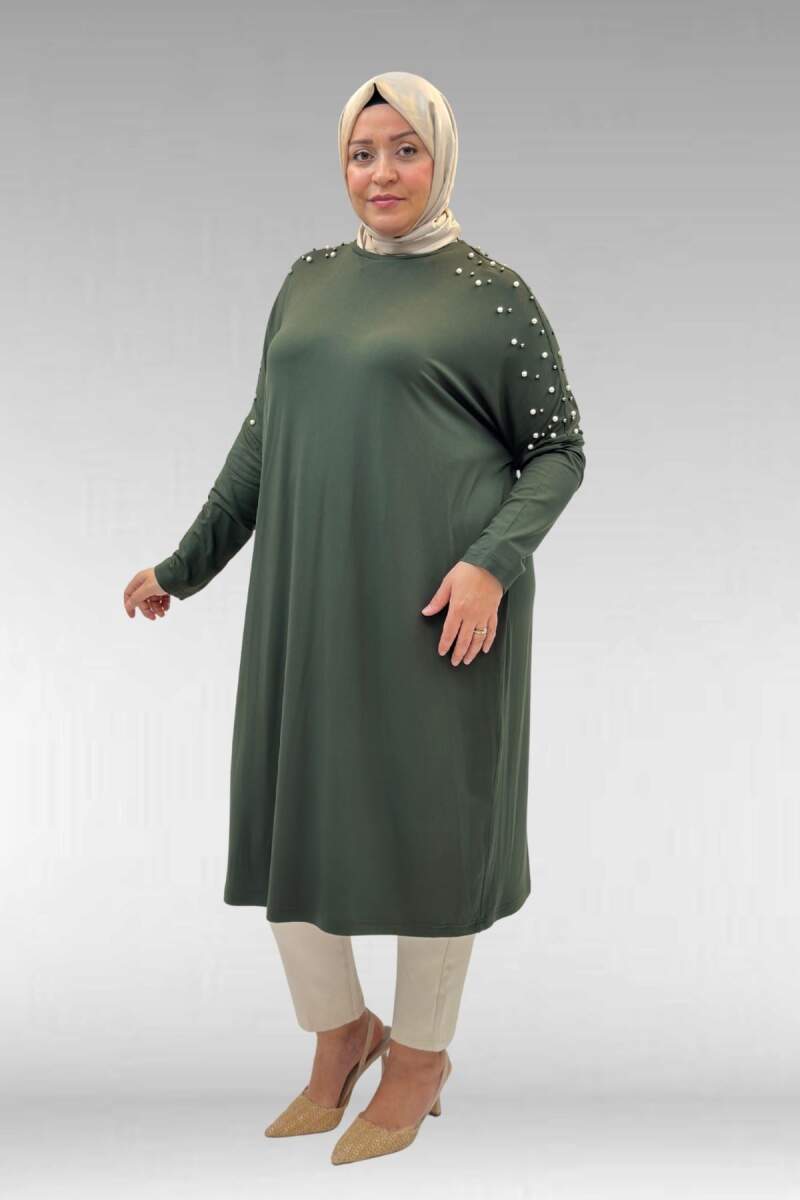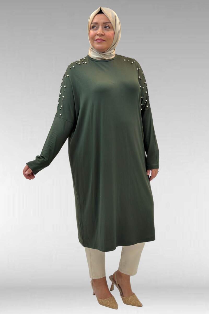68012 Büyük Beden Omuzları Taş Detaylı Penye Tunik - Haki