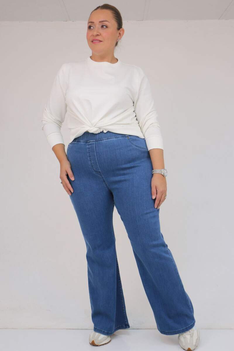 9137-18 Büyük Beden Beli Lastikli İspanyol Paça Kot Pantolon - Mavi
