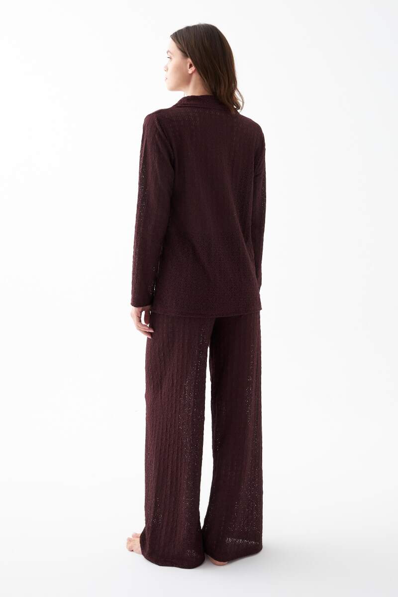 Yumuşak dokusu ve dantel hissi veren ajurlu kumaşıyla, ev giyiminde sade ama etkileyici bir şıklık sunar. Mürdümün derin tonu, feminen ve zamansız bir görünüm yaratır.