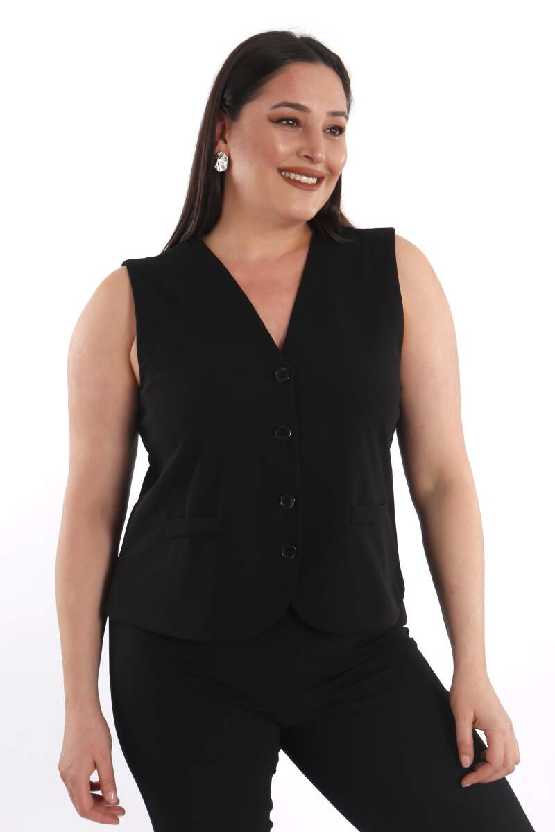 Angelino Büyük Beden Düğme Detaylı Siyah Yelek modeli; düğme detayı ile şıklığın mümkün olabildiğini, muhteşem görüntüsüyle sizlere kanıtlıyor. Kısa kol detaylı yelek modeli; V yaka duruşu, rahat kesimi ve önünde bulunan düğme detayı ile sizleri ileri seviye şıklığa davet ediyor.