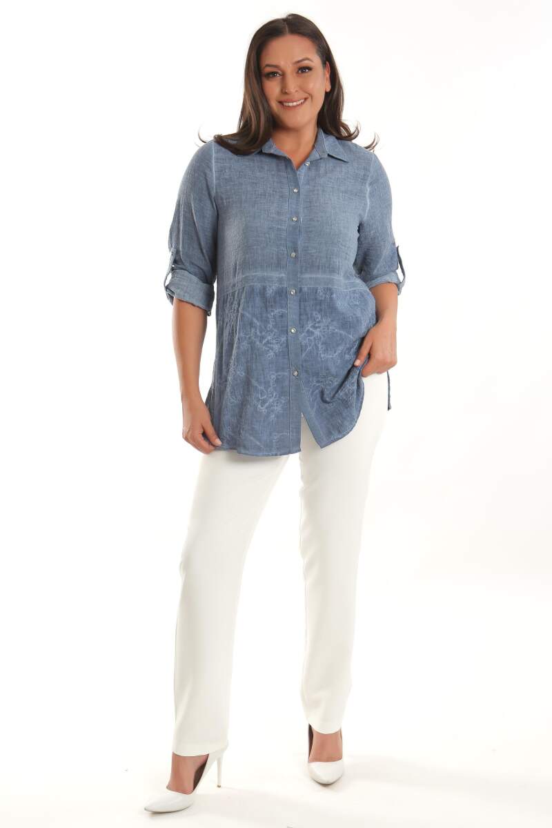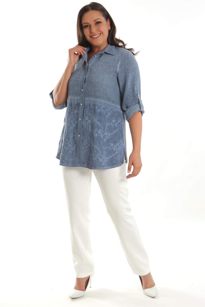 Angelino Büyük Beden Lacivert Ön Alt Nakışlı Batik Yıkamalı Gömlek, bahar ve yaz aylarının bitmeyen enerjisini nakış detayından alan gömleğimiz ile yakala! Hoş dokusu ile seni büyüleyecek olan bu gömleğimizi kumaş pantolonlar ile birleştirmek isteyebilirsin. Hafif dokusu ile rahatlığı hissederken en yoğun günlerin bile enerjik geçecek! :)
