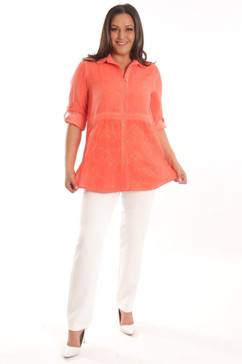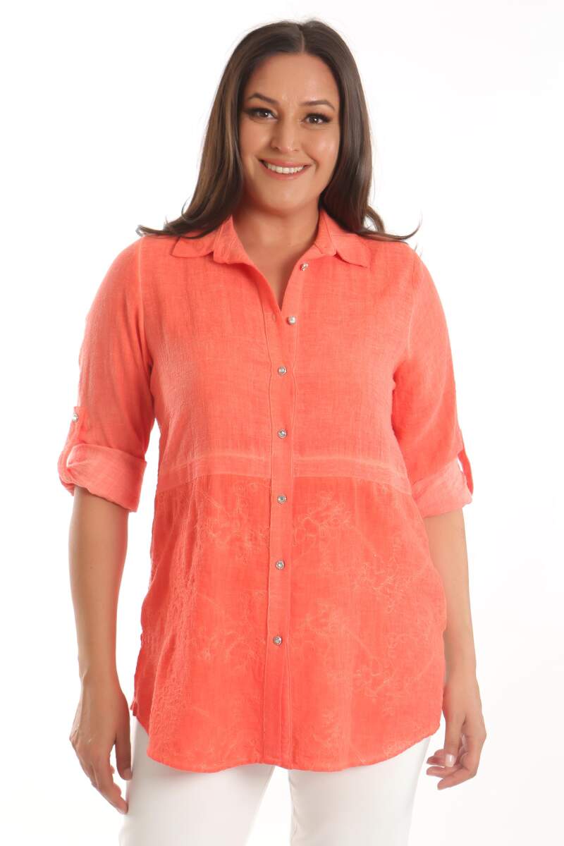 Angelino Büyük Beden Oranj Ön Alt Nakışlı Batik Yıkamalı Gömlek, bahar ve yaz aylarının bitmeyen enerjisini nakış detayından alan gömleğimiz ile yakala! Hoş dokusu ile seni büyüleyecek olan bu gömleğimizi kumaş pantolonlar ile birleştirmek isteyebilirsin. Hafif dokusu ile rahatlığı hissederken en yoğun günlerin bile enerjik geçecek! :)