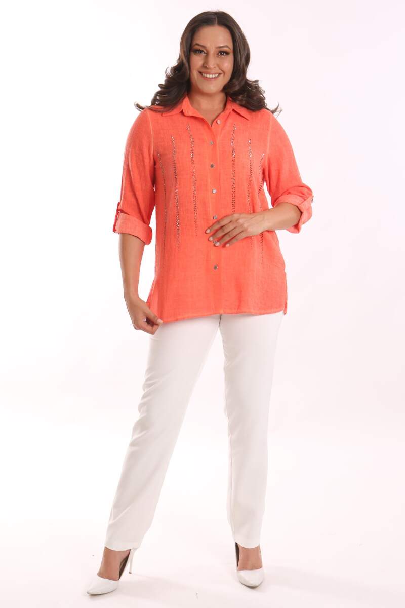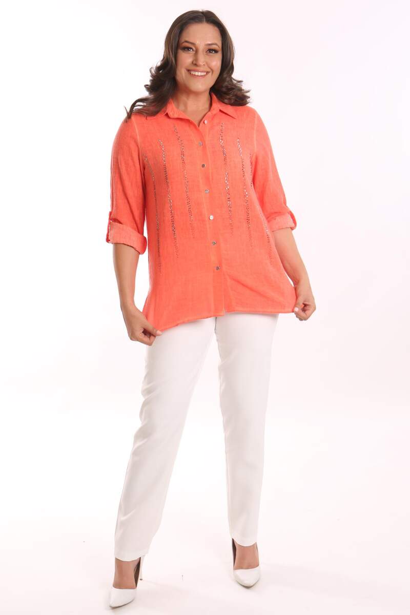 Angelino Büyük Beden Oranj Taş Baskılı Batik Yıkamalı Gömlek, bahar ve yaz aylarının bitmeyen enerjisini nakış detayından alan gömleğimiz ile yakala! Hoş dokusu ile seni büyüleyecek olan bu gömleğimizi kumaş pantolonlar ile birleştirmek isteyebilirsin. Hafif dokusu ile rahatlığı hissederken en yoğun günlerin bile enerjik geçecek! :)