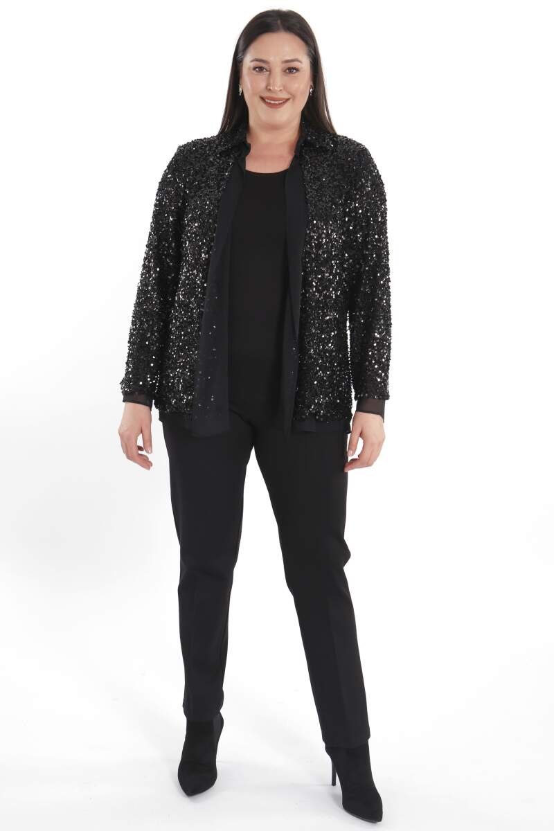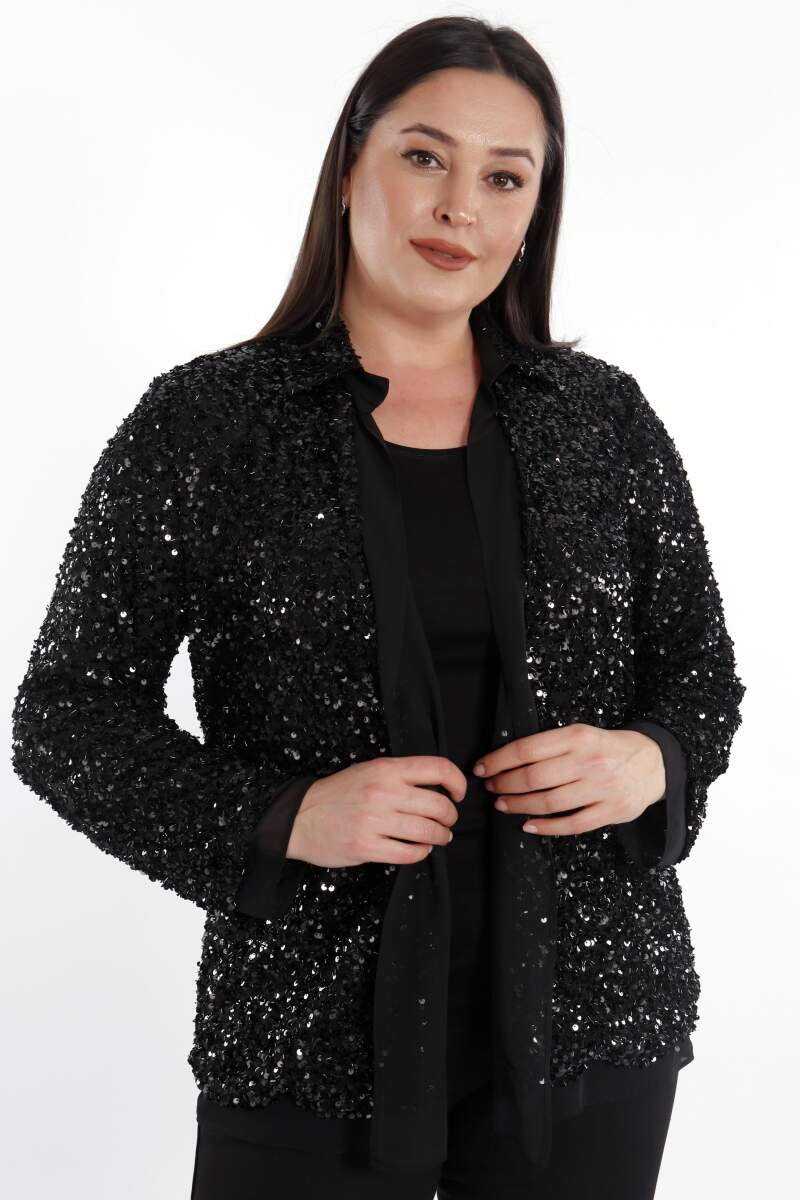 Büyük Beden Payetli Şifon Garnili Abiye Siyah Ceket, payetli kumaş sayesinde dikkat çeken ışıltılı görünüş ile özel günler ve davetlerin ayrılmaz parçası. Bluz, gömlek, pantolon ve eteklerinizle rahatlıkla kombinleye bileceğiniz Angelino Büyük Beden Payetli Şifon Garnili Abiye Siyah Ceket.