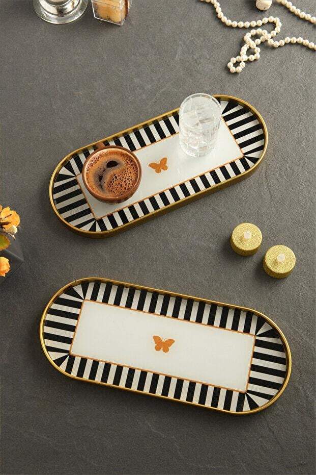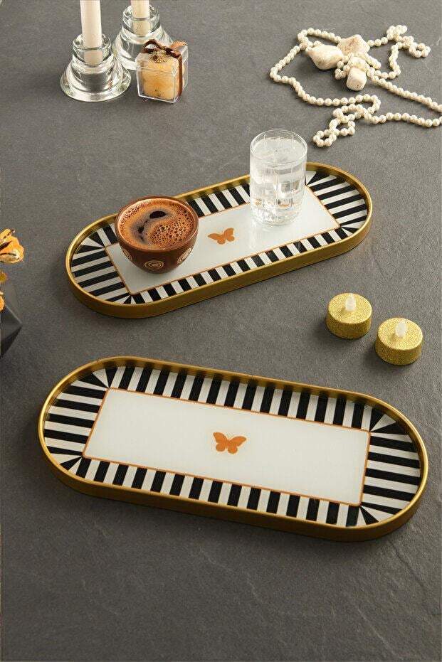 Kelebek Desen Detaylı Cam Sunum Tepsisi Gold 2 Adet 12x30 cm