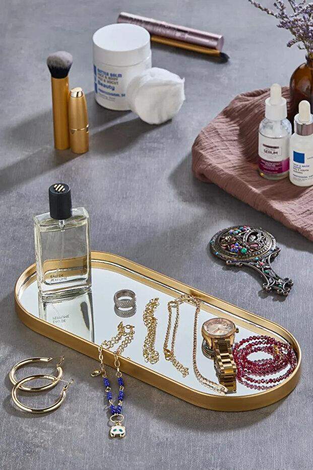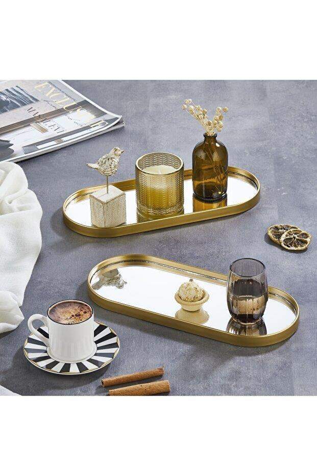 Oval Aynalı Gold 12x30 İkramlık Kahve ve Çay Sunum Tepsisi (Çok Amaçlı)