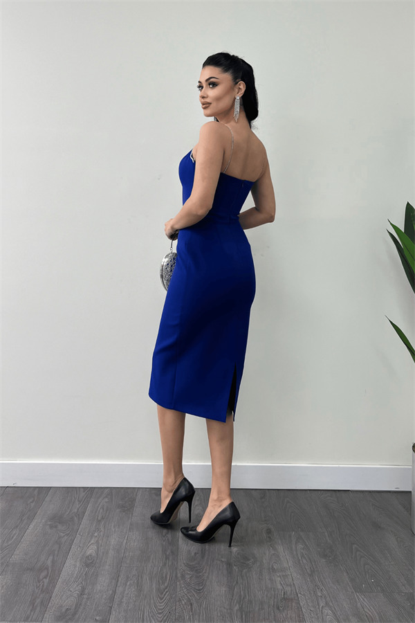 Atlas Kumaş Askılı Payet Detaylı Kalem Elbise - SAKS MAVİ