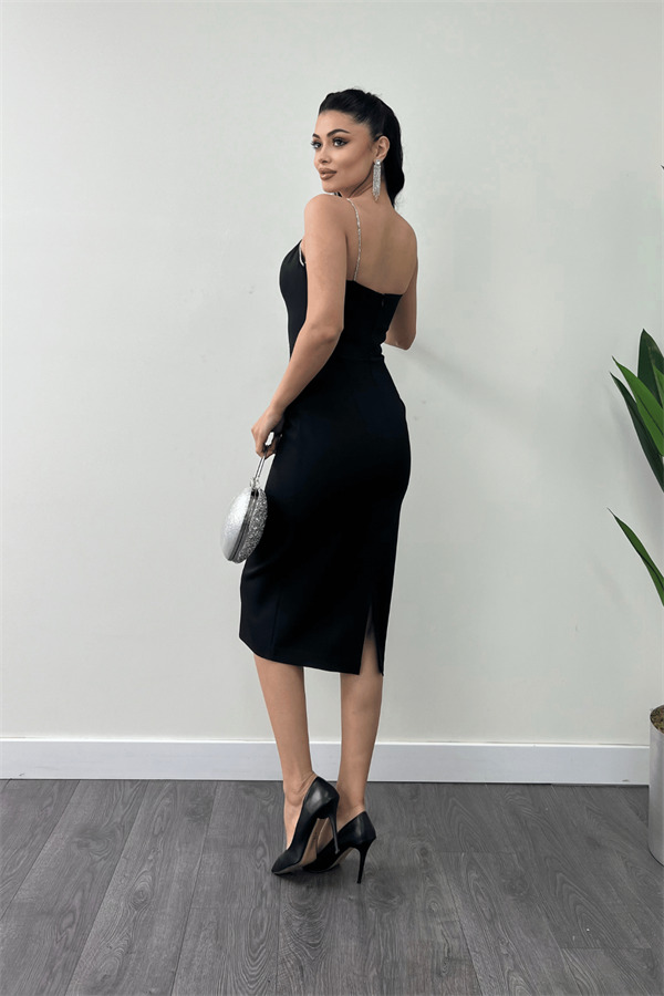 Atlas Kumaş Askılı Payet Detaylı Kalem Elbise - SİYAH