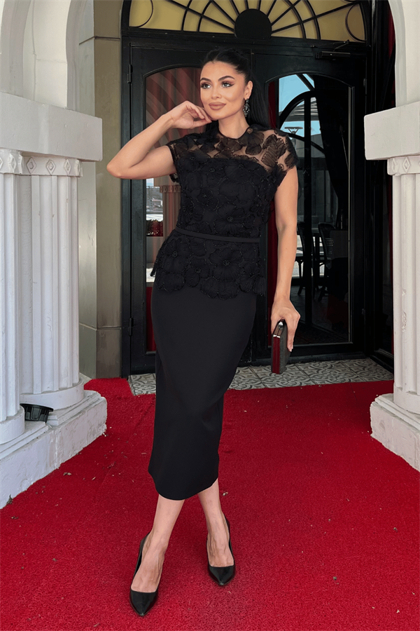 Atlas Kumaş Boncuk Detaylı Kalem Elbise - SİYAH