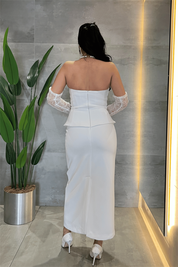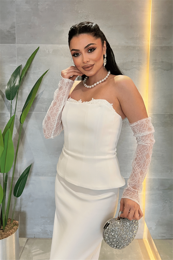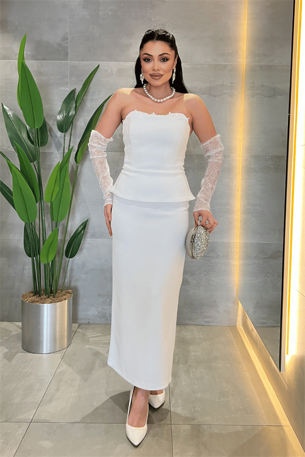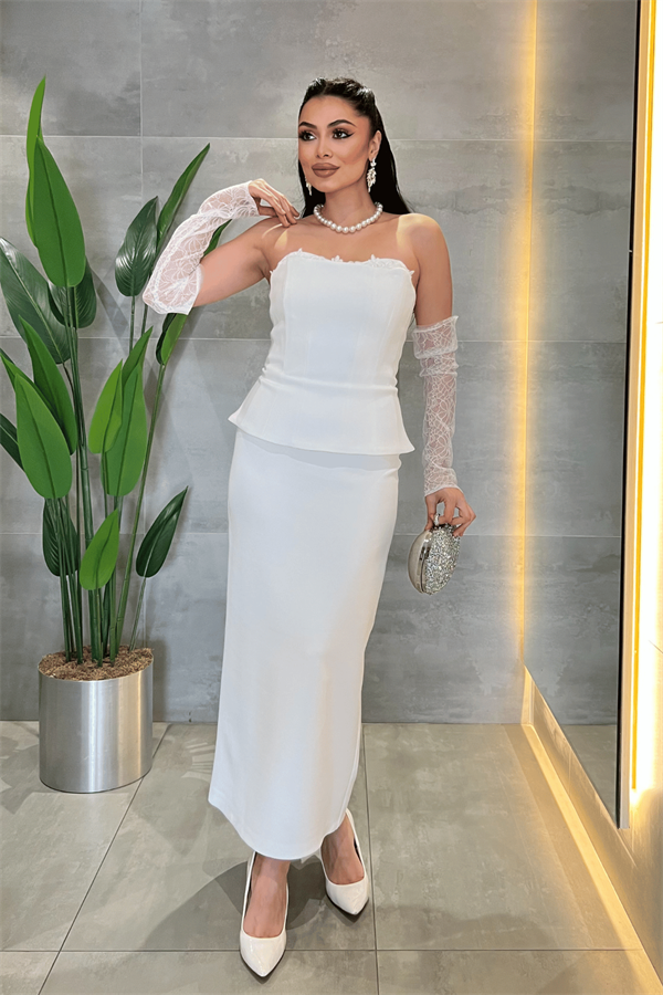 Atlas Kumaş Dantel Detaylı Straplez Elibse - BEYAZ