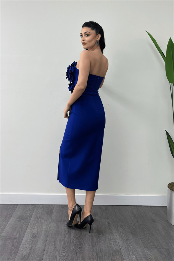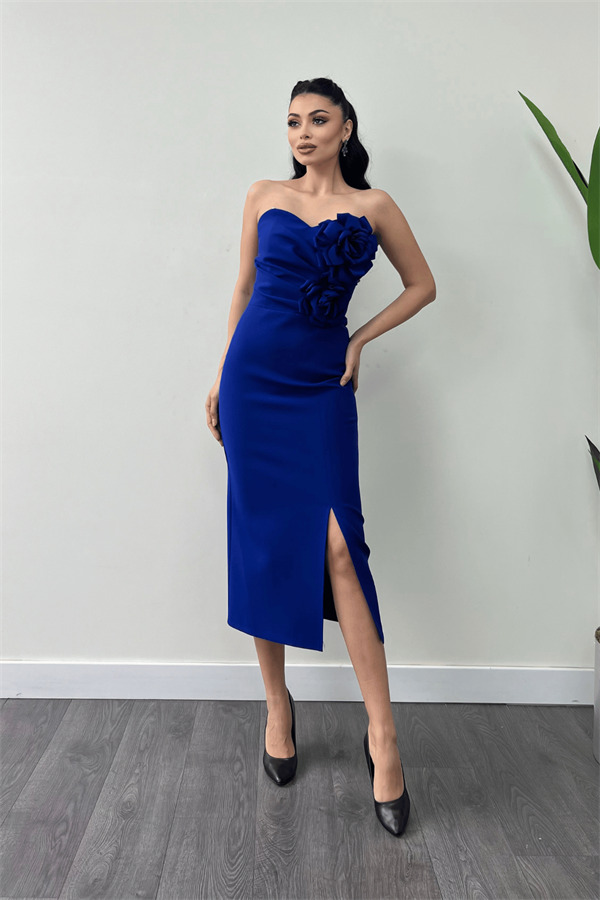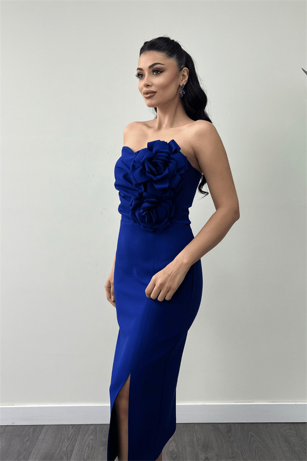 Atlas Kumaş Gül Detaylı Straplez Kalem Elbise - SAKS MAVİ