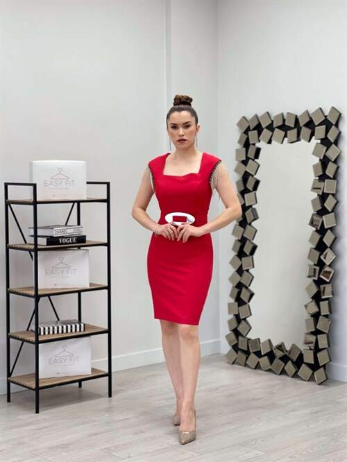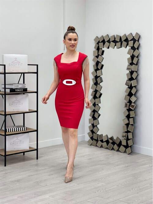 Atlas Kumaş Kare Yaka Omuz Taşlı Püsküllü Elbise - KIRMIZI