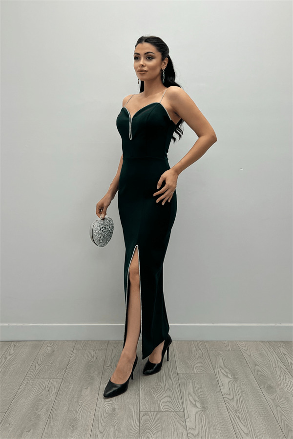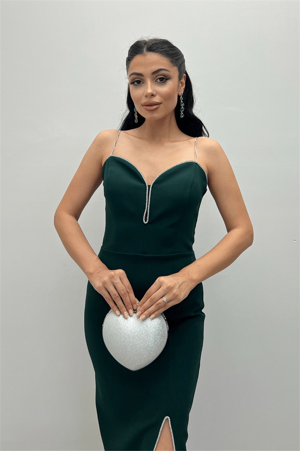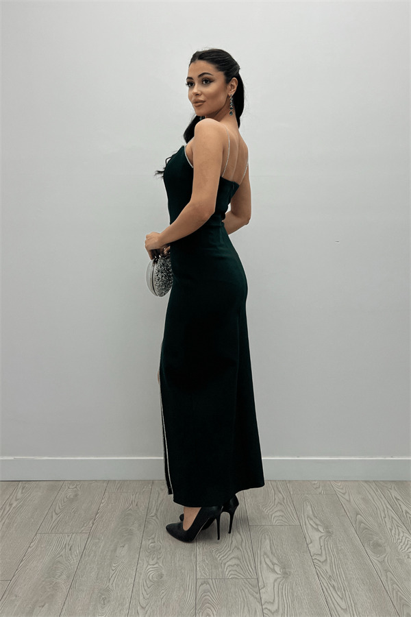 Atlas Kumaş Payet Askı Detaylı Kalem Elbise - ZÜMRÜT YEŞİL
