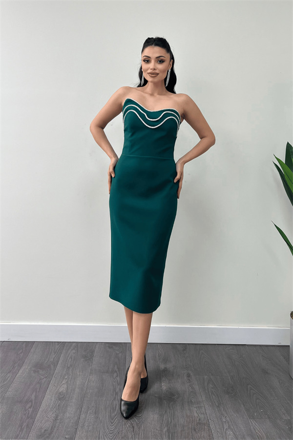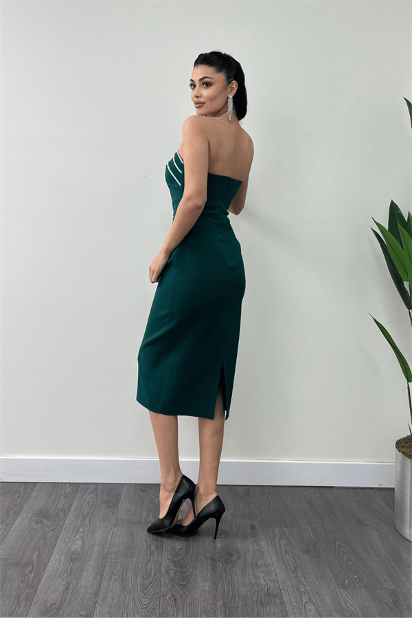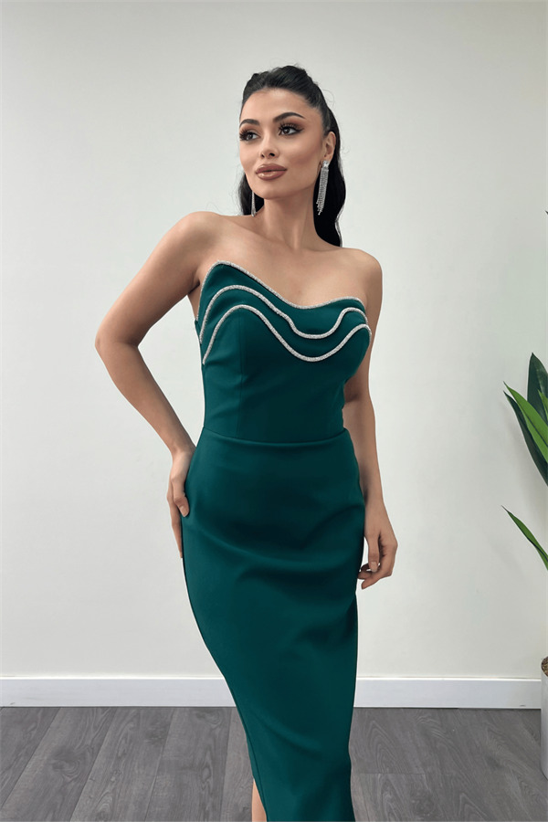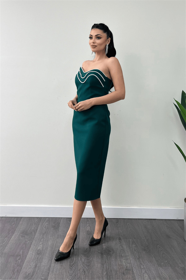 Atlas Kumaş Straplez Kalem Elbise - ZÜMRÜT YEŞİL