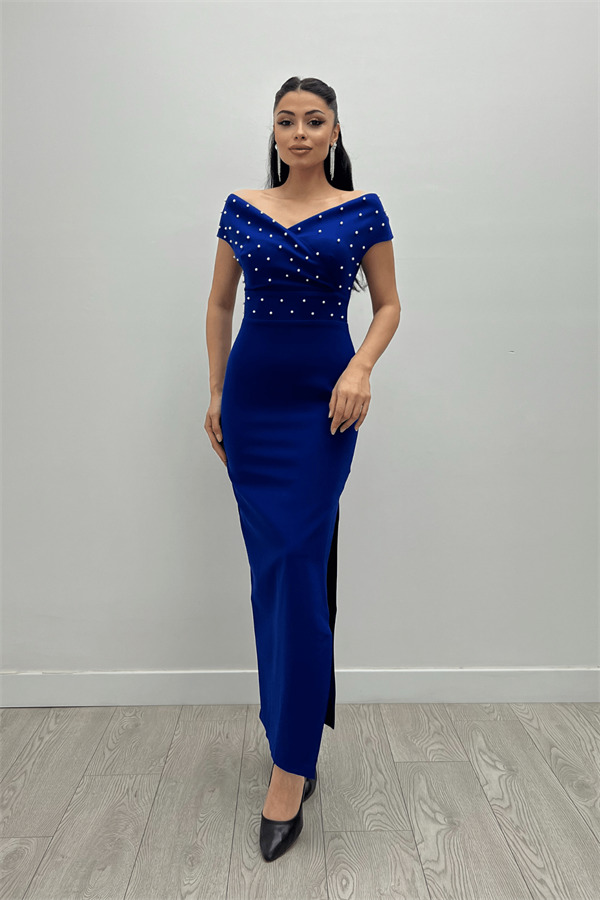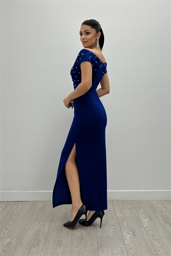 Babel Kumaş Kayık Yaka İnci Detaylı Kalem Elbise - SAKS MAVİ