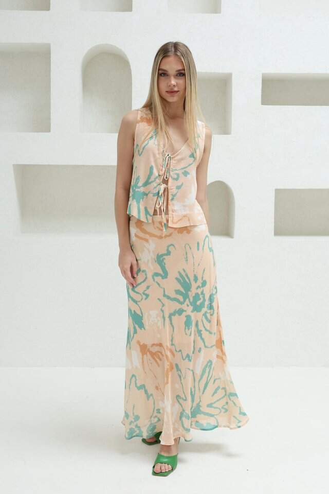 Bağcıklı Bluzlu Etek Takım - Pudra