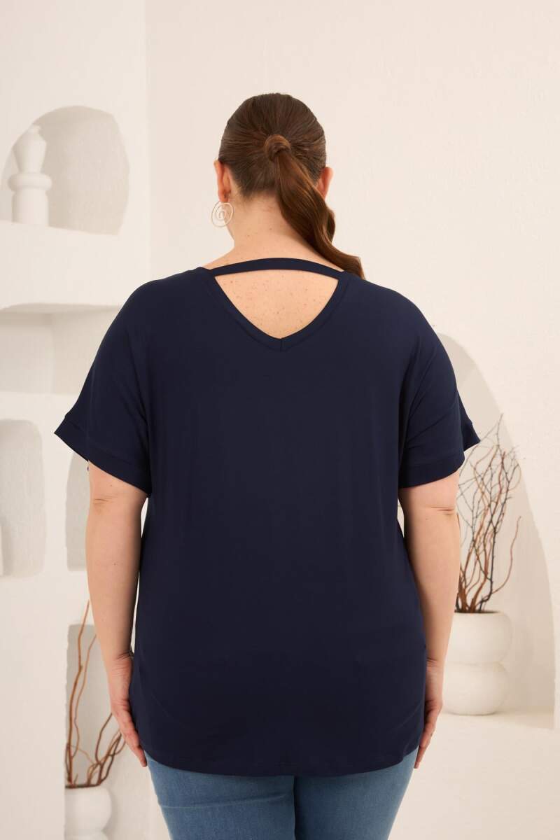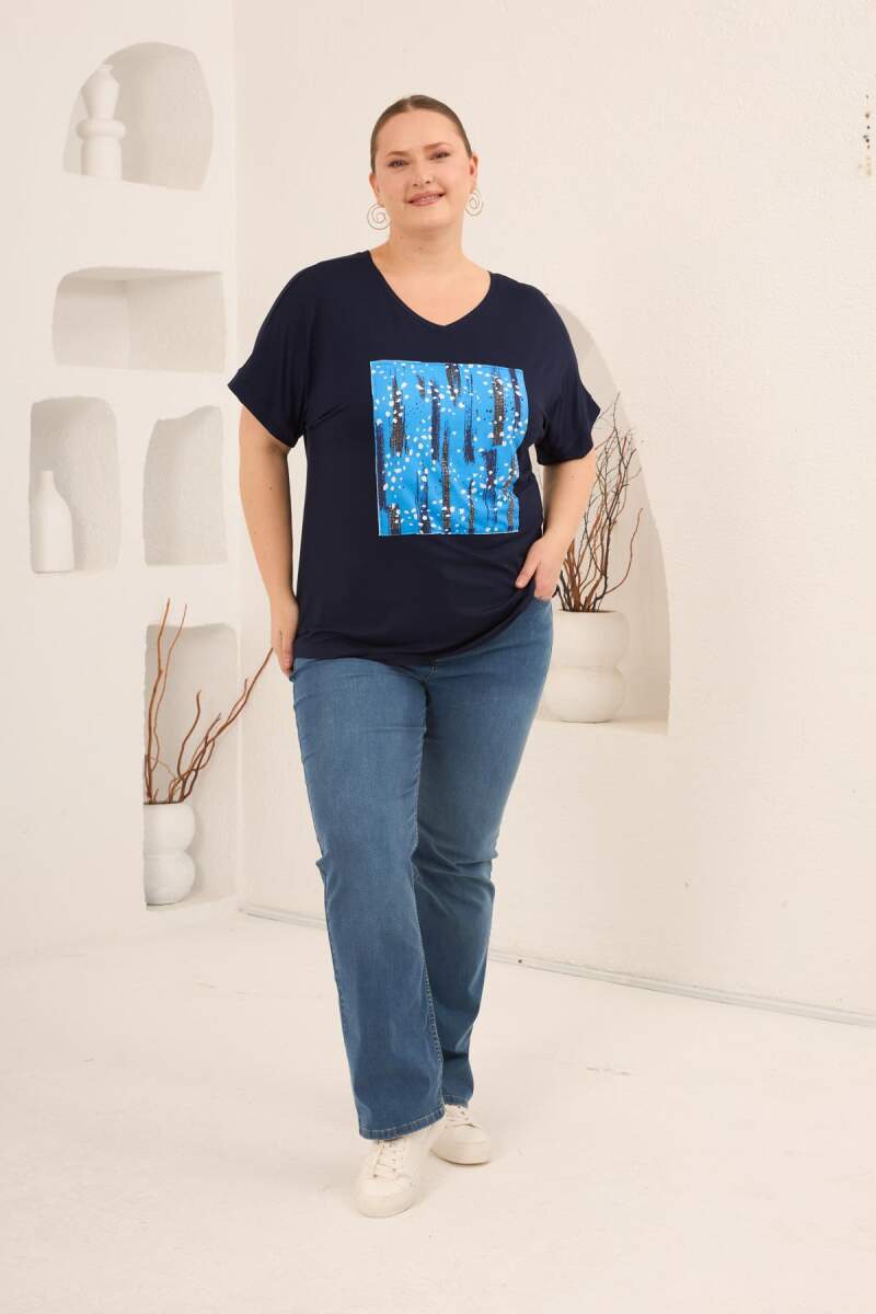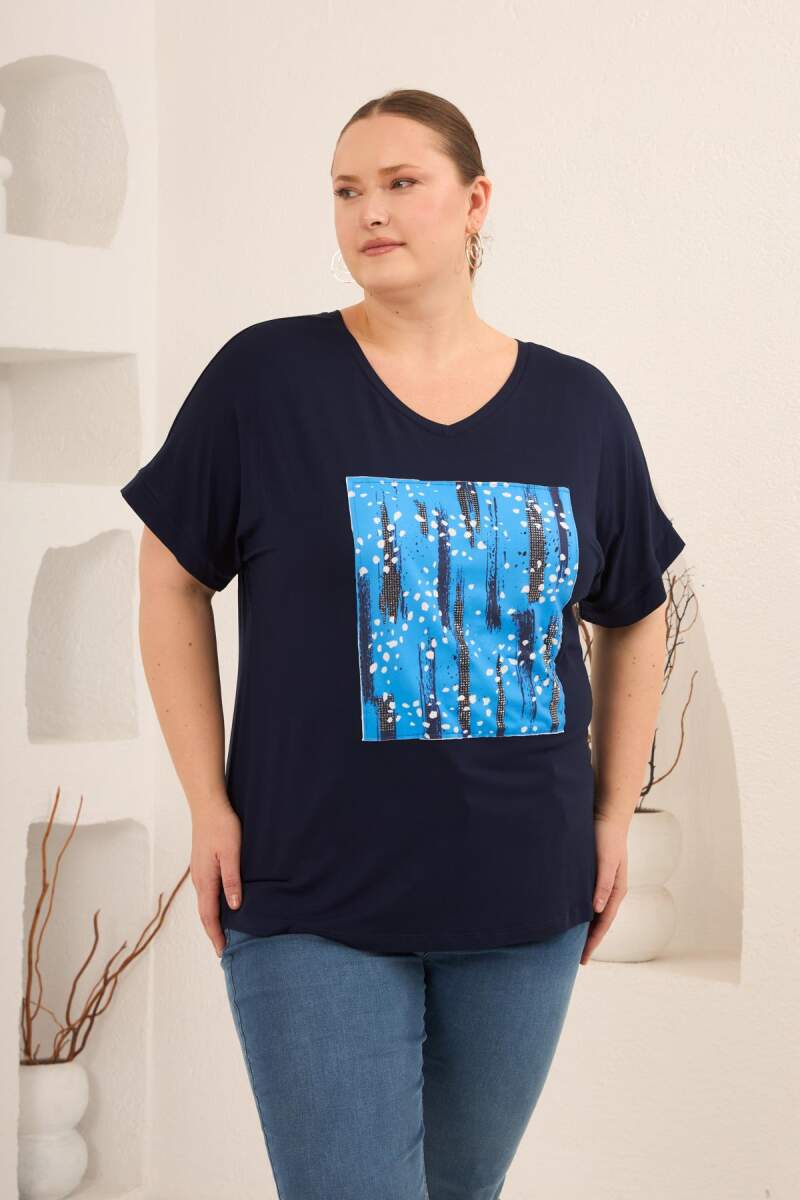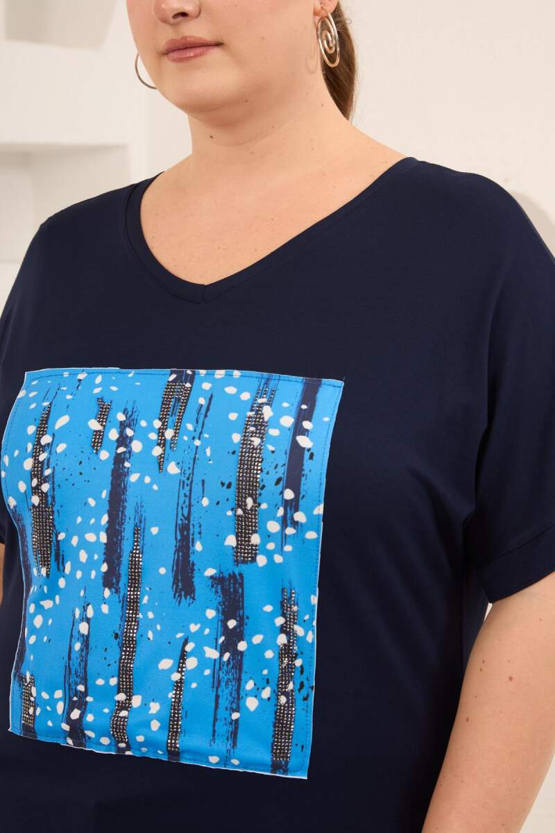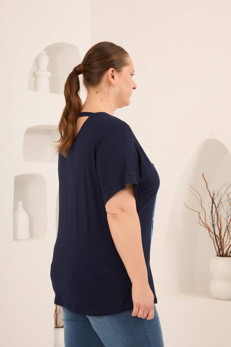 Baskılı Taş Detaylı Büyük Beden Tişört Lacivert
