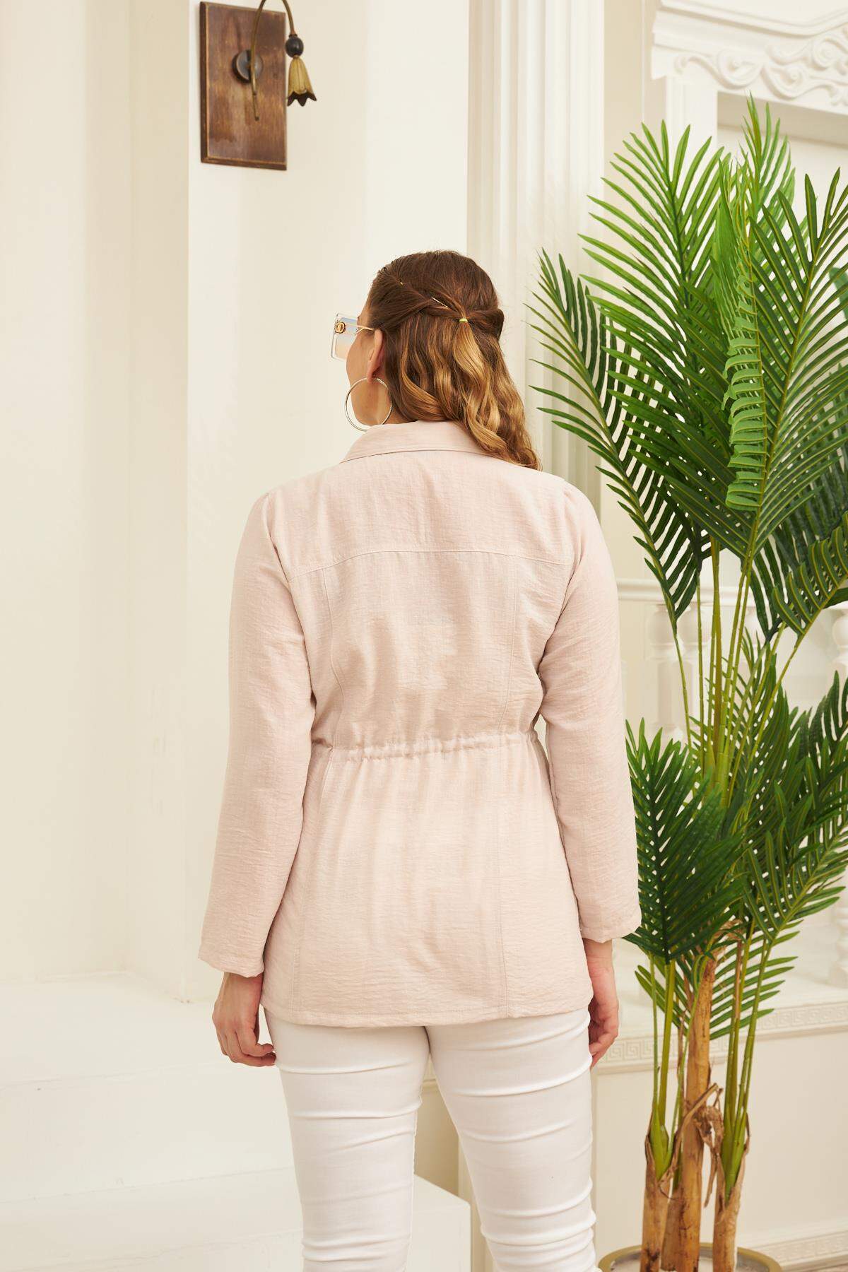 Bel Bağcık Detaylı Büyük Beden Krem Keten Ceket
