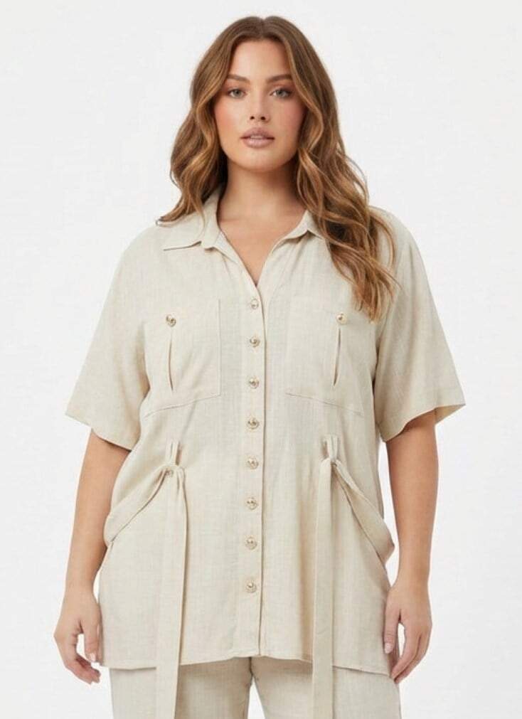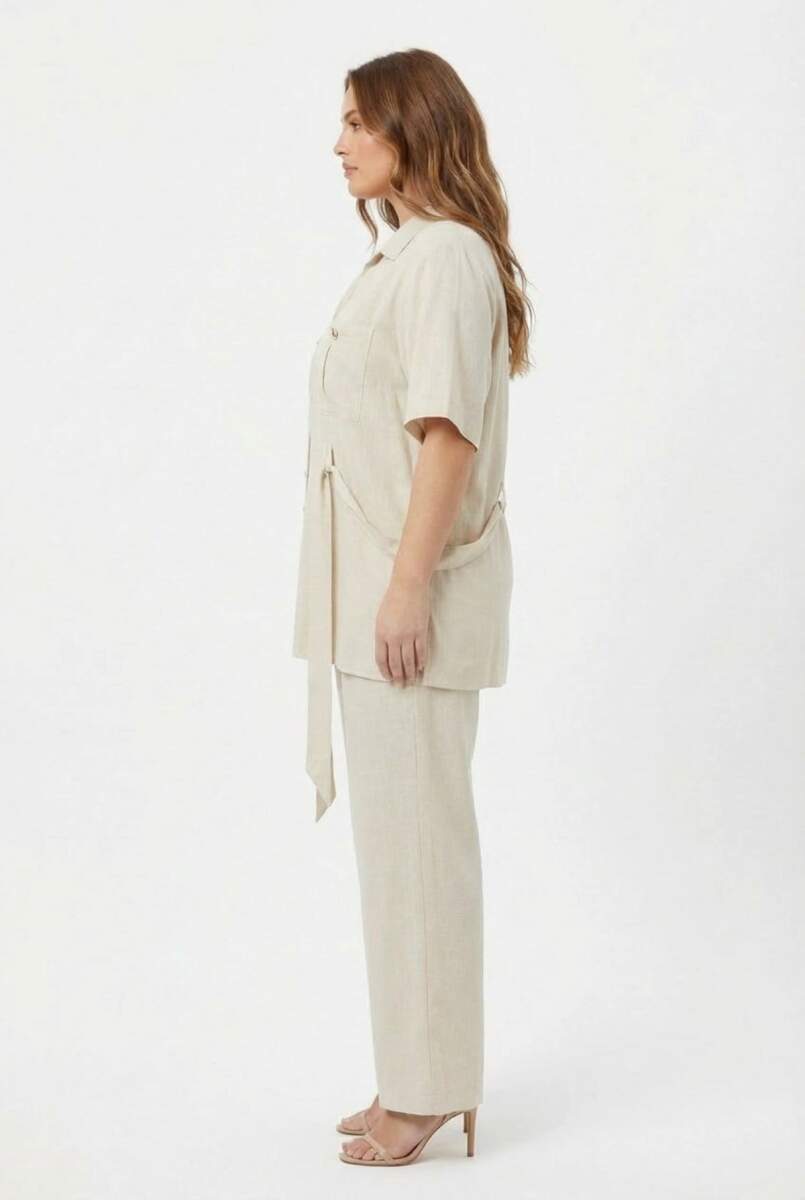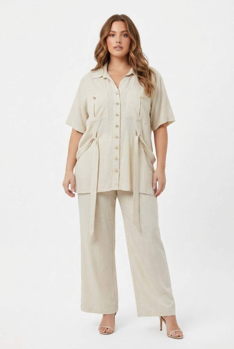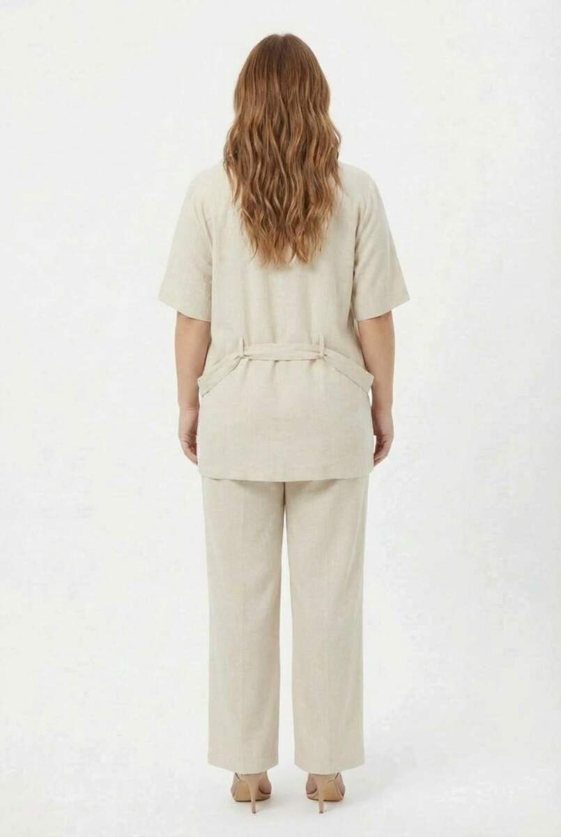 Bel Bağcık Detaylı Kadın Büyük Beden Ceket Pantolon İkili Takım Bej