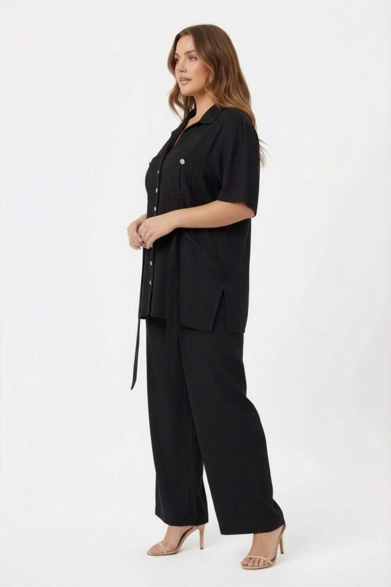 Bel Bağcık Detaylı Kadın Büyük Beden Ceket Pantolon İkili Takım Siyah