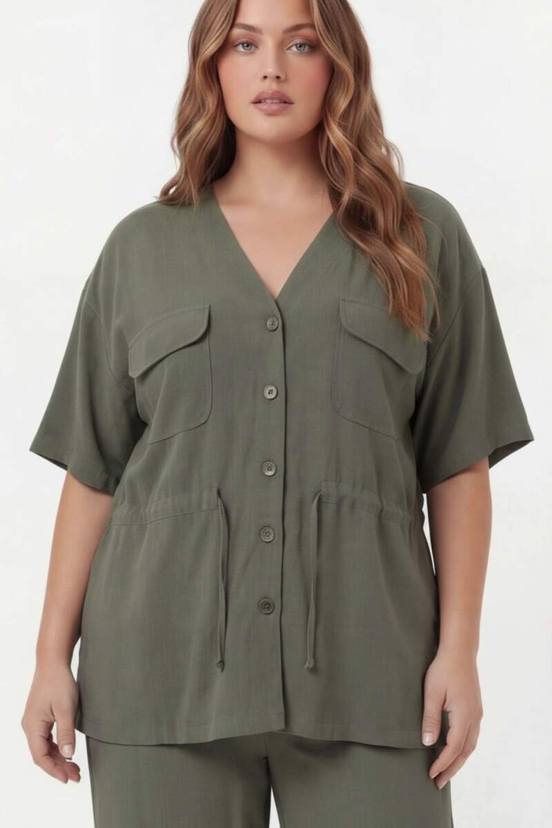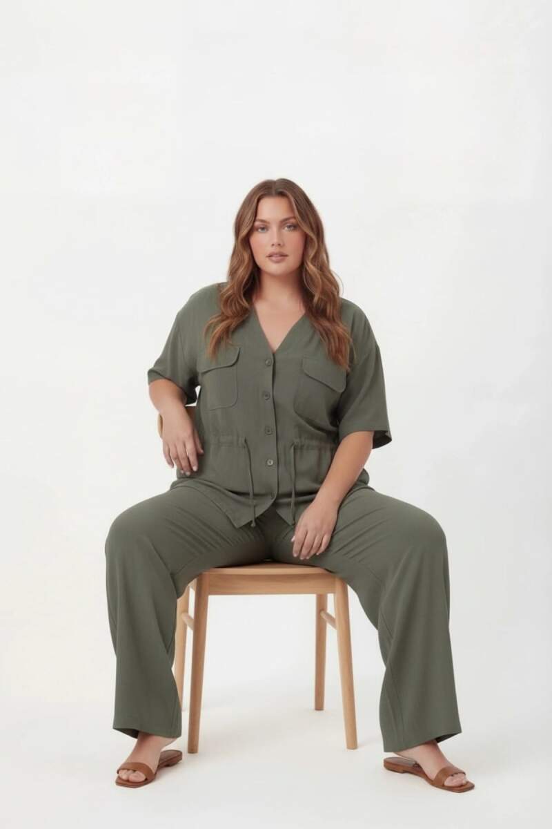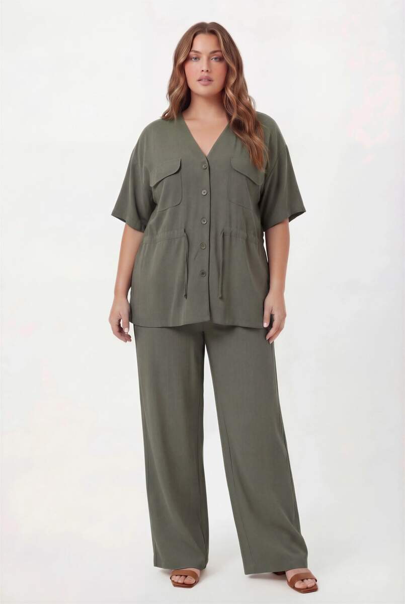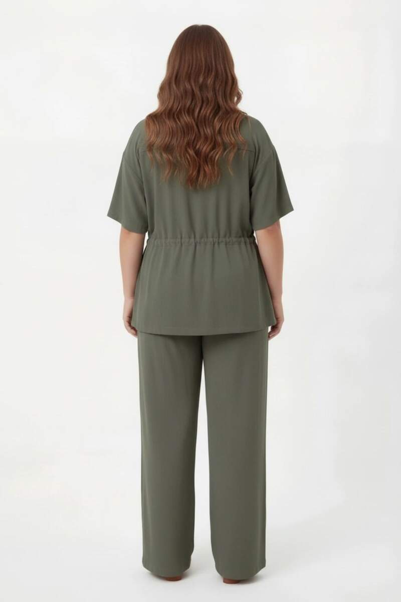 Bel Bağcık Detaylı V Yaka Kadın Büyük Beden Ceket Pantolon Takım Haki