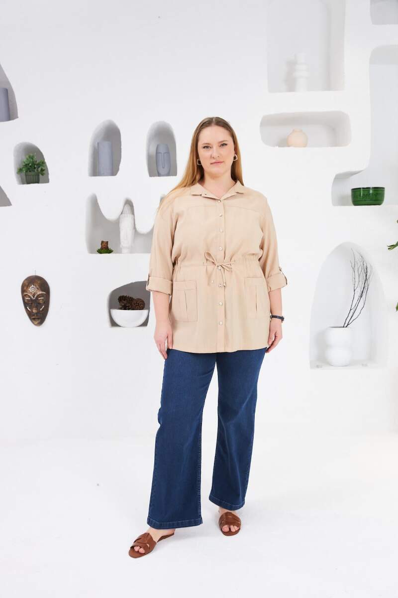 Bel Bağcıklı Cep Detaylı Büyük Beden Ceket Krem
