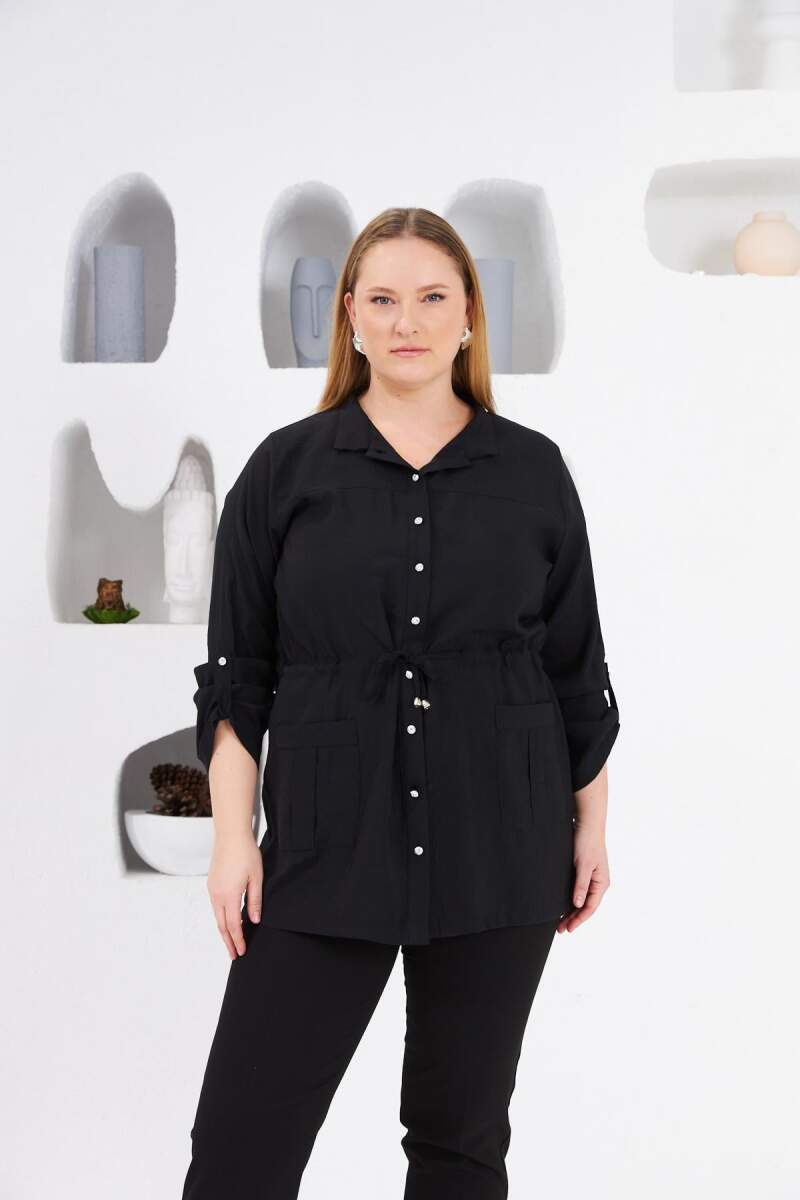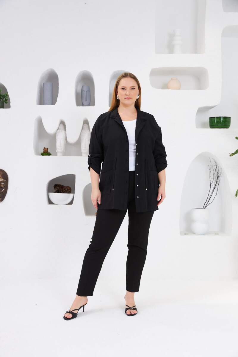 Şık ve modern tasarımıyla öne çıkan Bel Bağcıklı Cep Detaylı Büyük Beden Ceket, rahat kesimi sayesinde konforlu bir kullanım sunar. Ayarlanabilir bel bağcığı ile vücuda uyum sağlar ve cep detaylarıyla fonksiyonelliği artırır. Siyah rengiyle her kombine uyum sağlayarak şıklığı tamamlar.