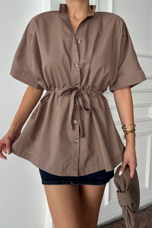 BEL BÜZGÜ DETAYLI POPLİN GÖMLEK - Kahverengi
