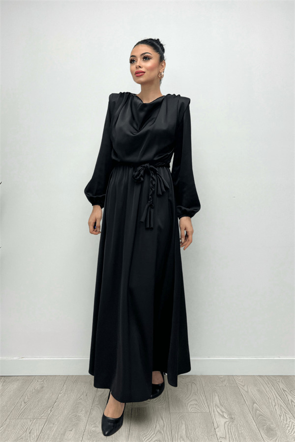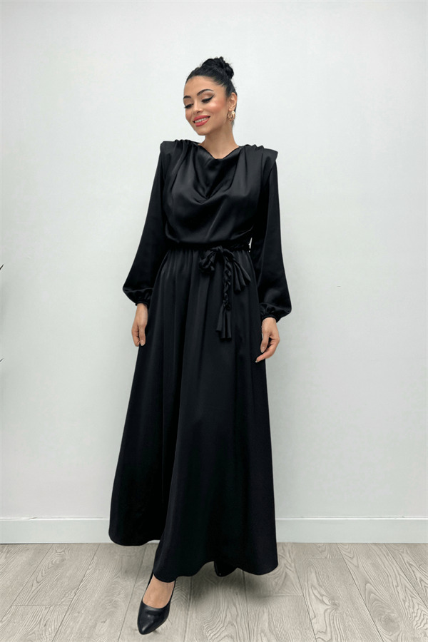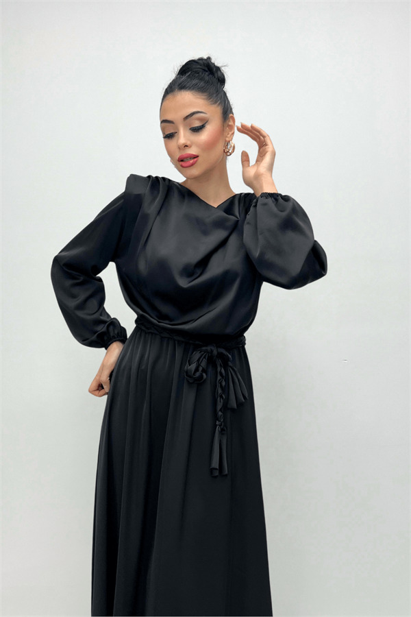 Beli Büzgülü Saten Abiye Elbise - SİYAH