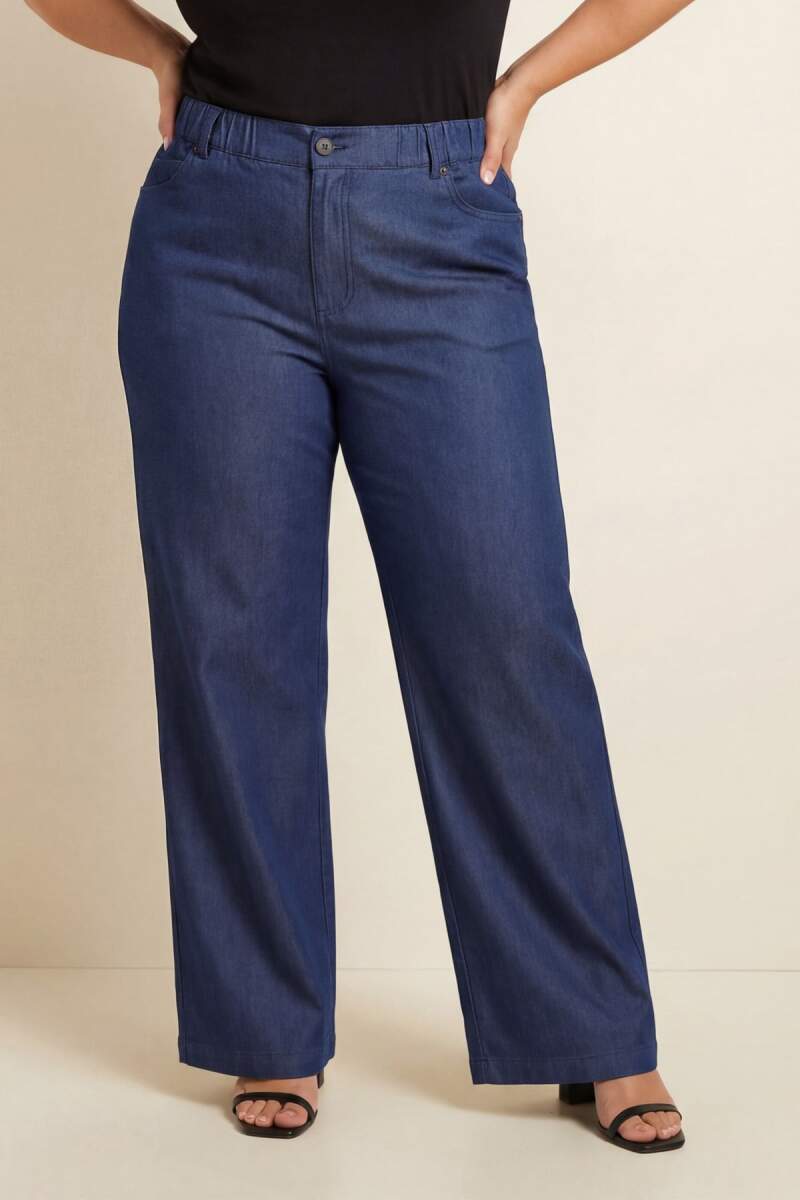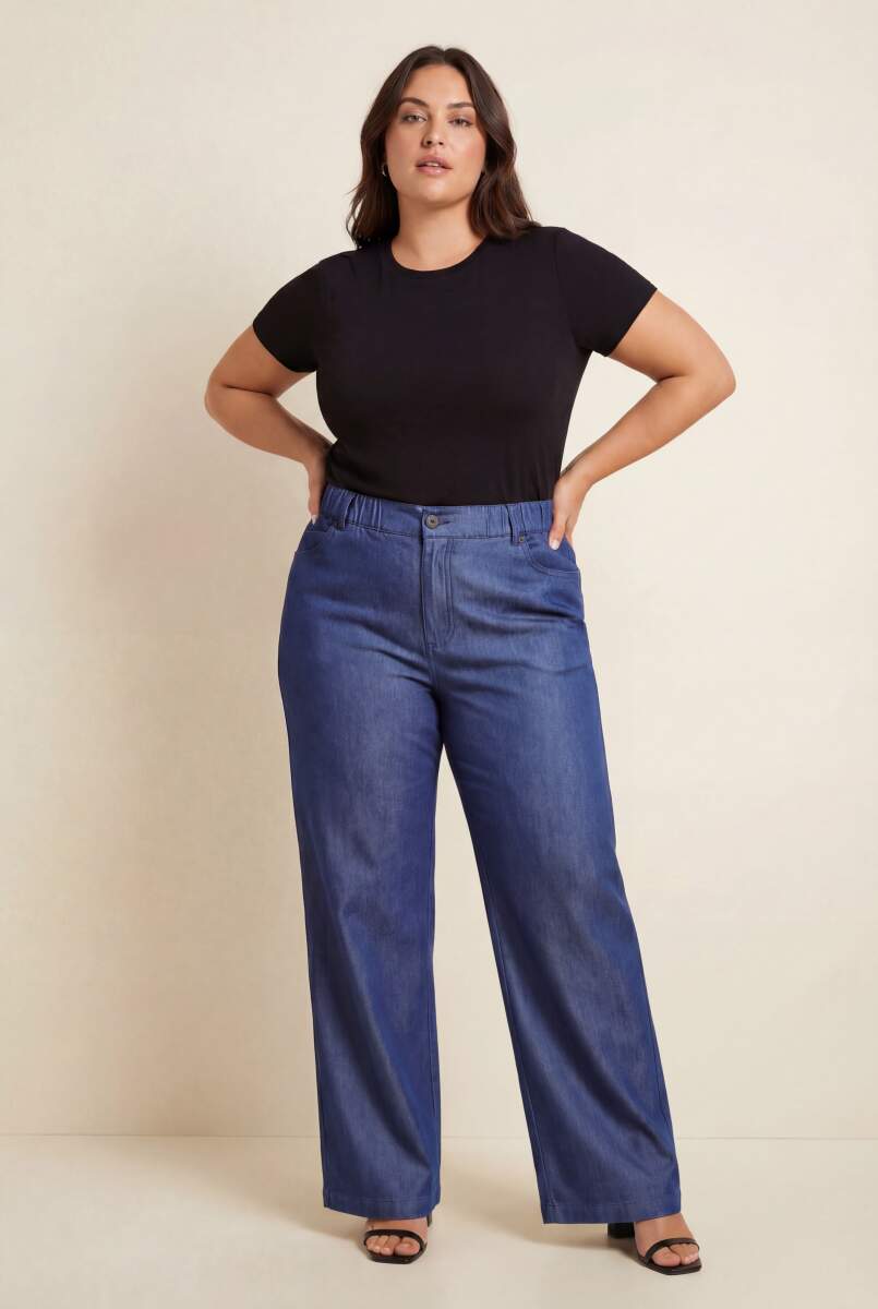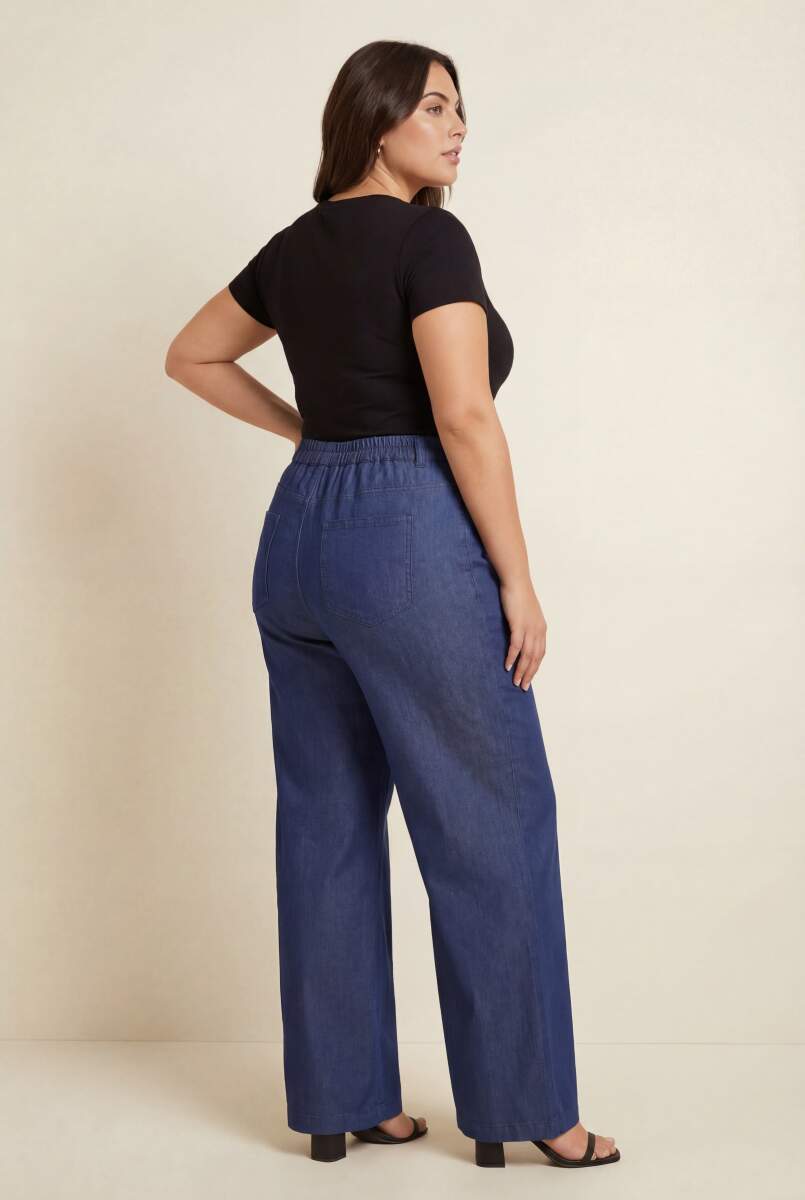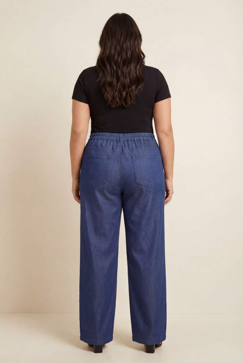 Beli Lastikli Kot Görünümlü Kadın Büyük Beden Kumaş Pantolon Mavi