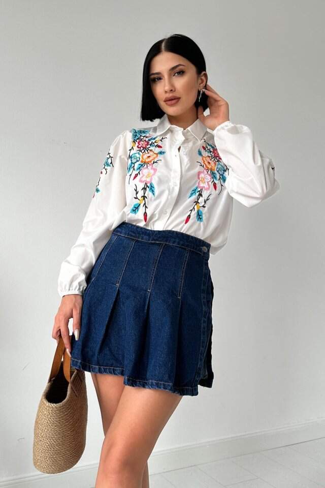 Beyaz Çiçek Nakışlı Gömlek
