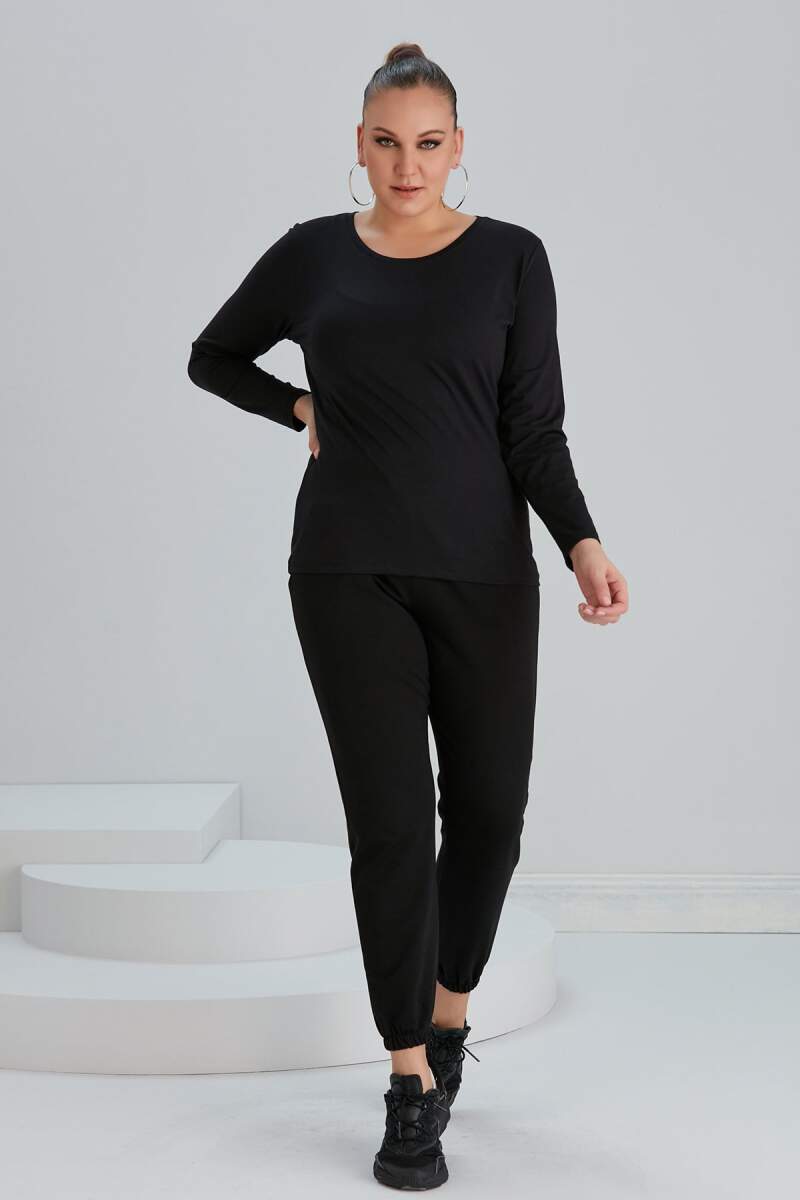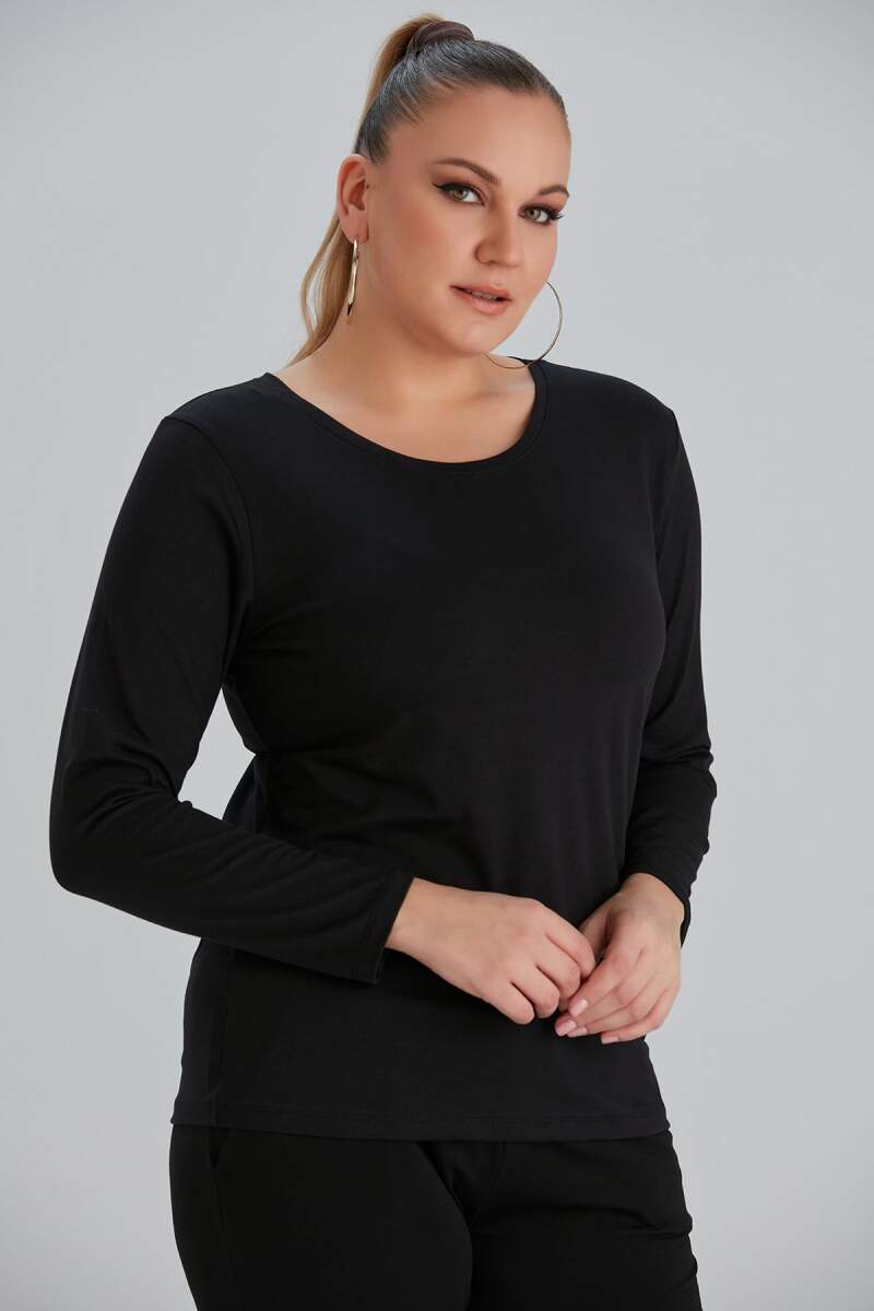 Bisiklet Yaka Uzun Kol Büyük Beden Siyah Tişört