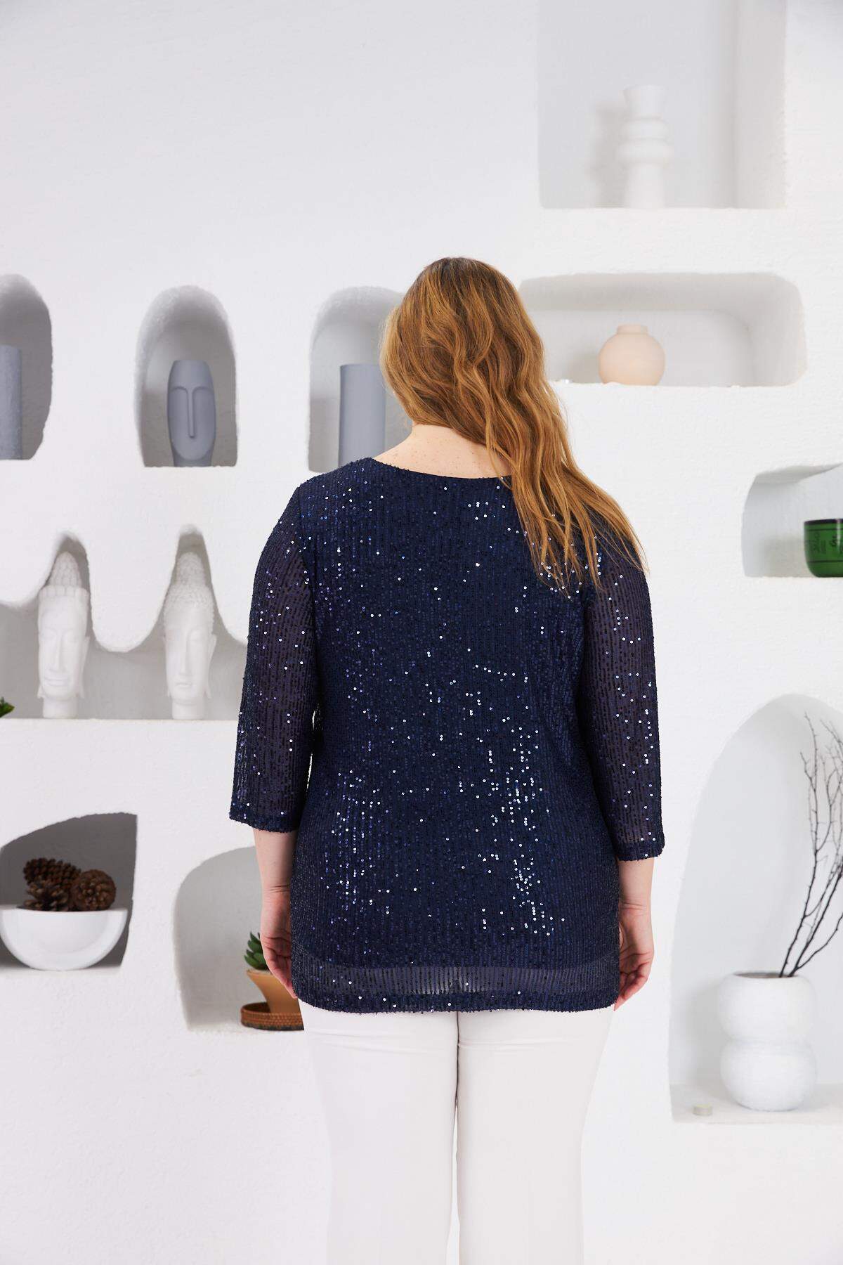 Büyük Beden Astarlı Pul Payet Bluz Lacivert