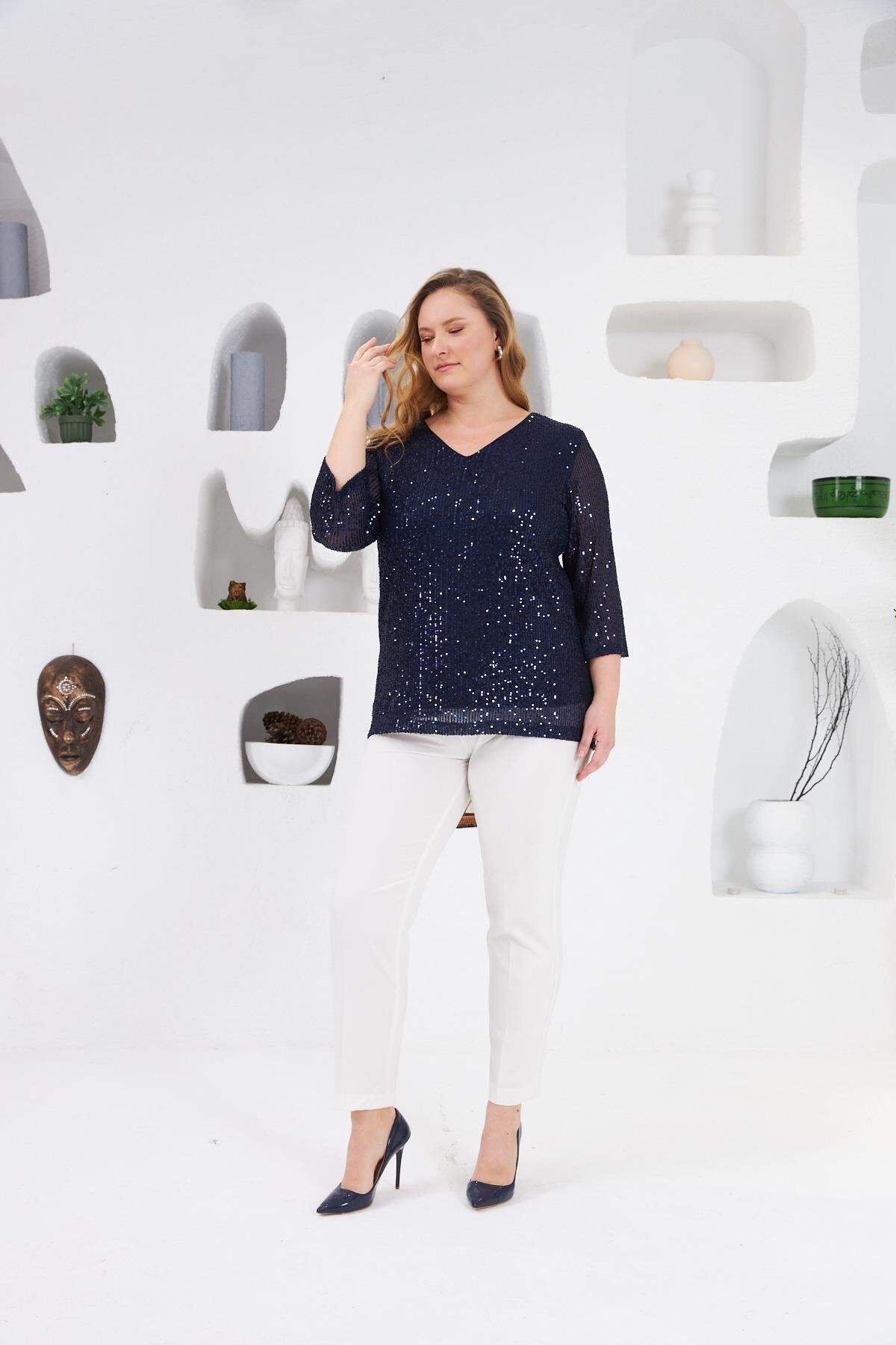 Angelino Büyük Beden Astarlı Pul Payet Bluz Lacivert