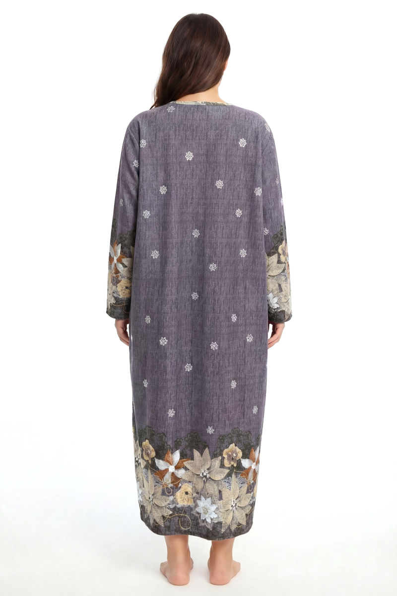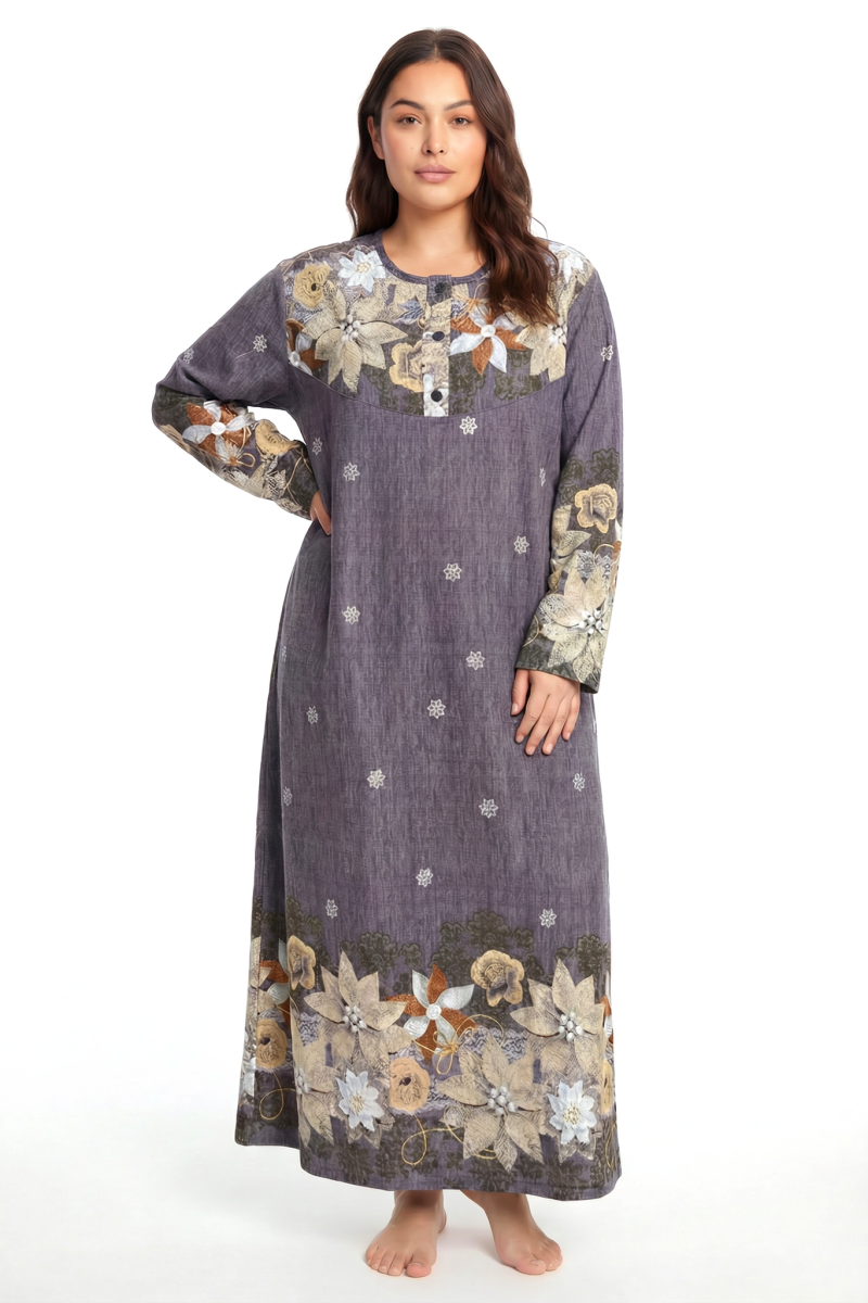 Zarif çiçek desenleri ve rahat kalıbıyla öne çıkan bu anne geceliği, evde ve uyku saatlerinde maksimum konfor sunmak için tasarlandı. Uzun boyu ve dökümlü yapısı sayesinde vücudu sıkmadan sarar, gün boyu rahat bir kullanım sağlar. Hem şık görünmek hem de özgürce hareket etmek isteyenler için ideal bir tercihtir.