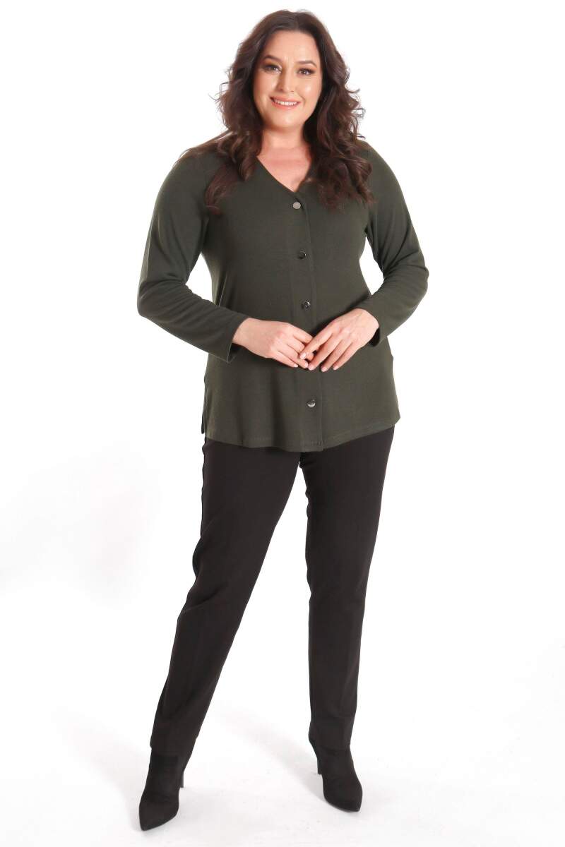 Büyük Beden Çıt Çıt Düğmeli Haki Hırka, tasarımda kullandığı yumuşak doku ile uzun süreli kullanımda konfor sunuyor. Kıyafetlerinizi ve şıklığınızı olumsuz hava şartlarında korurken aynı zamanda tamamlayan özel parçalardan birisi olan hırka modeli sahip olduğu rahat kalıbı ile şık bir görünüm sunuyor.