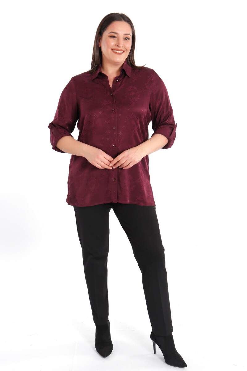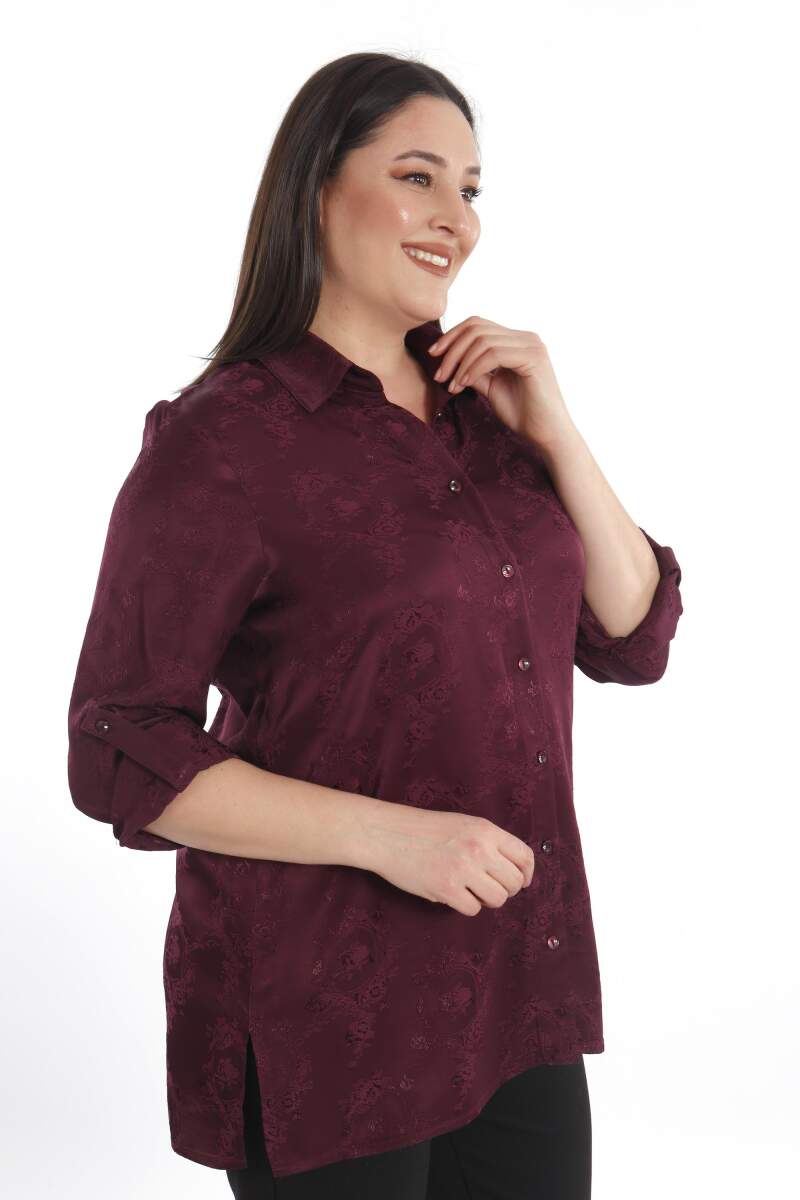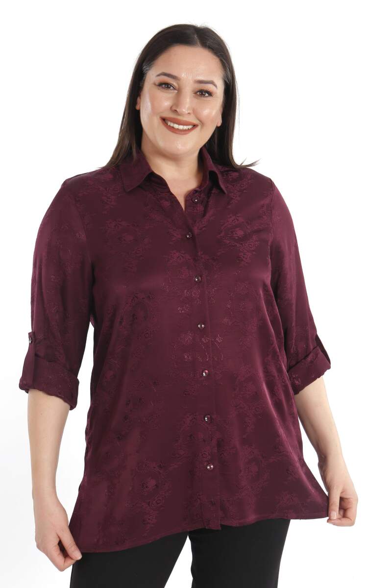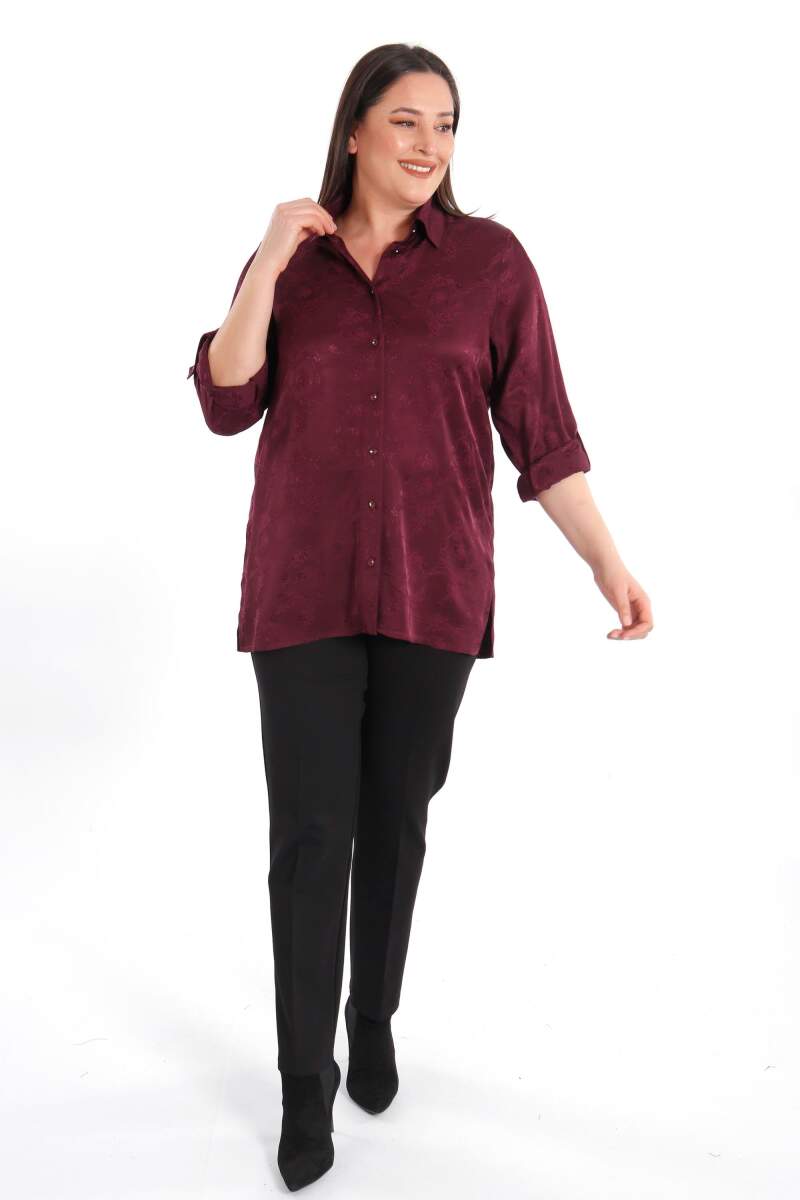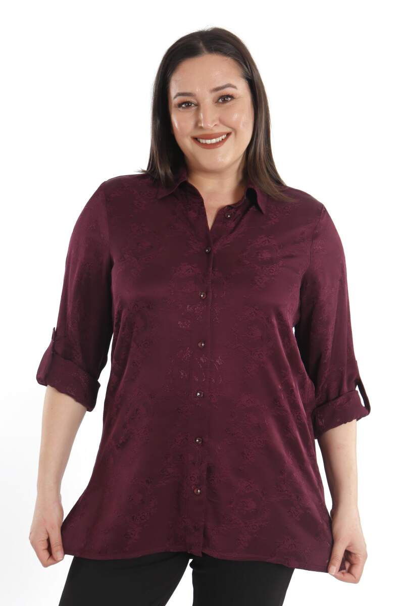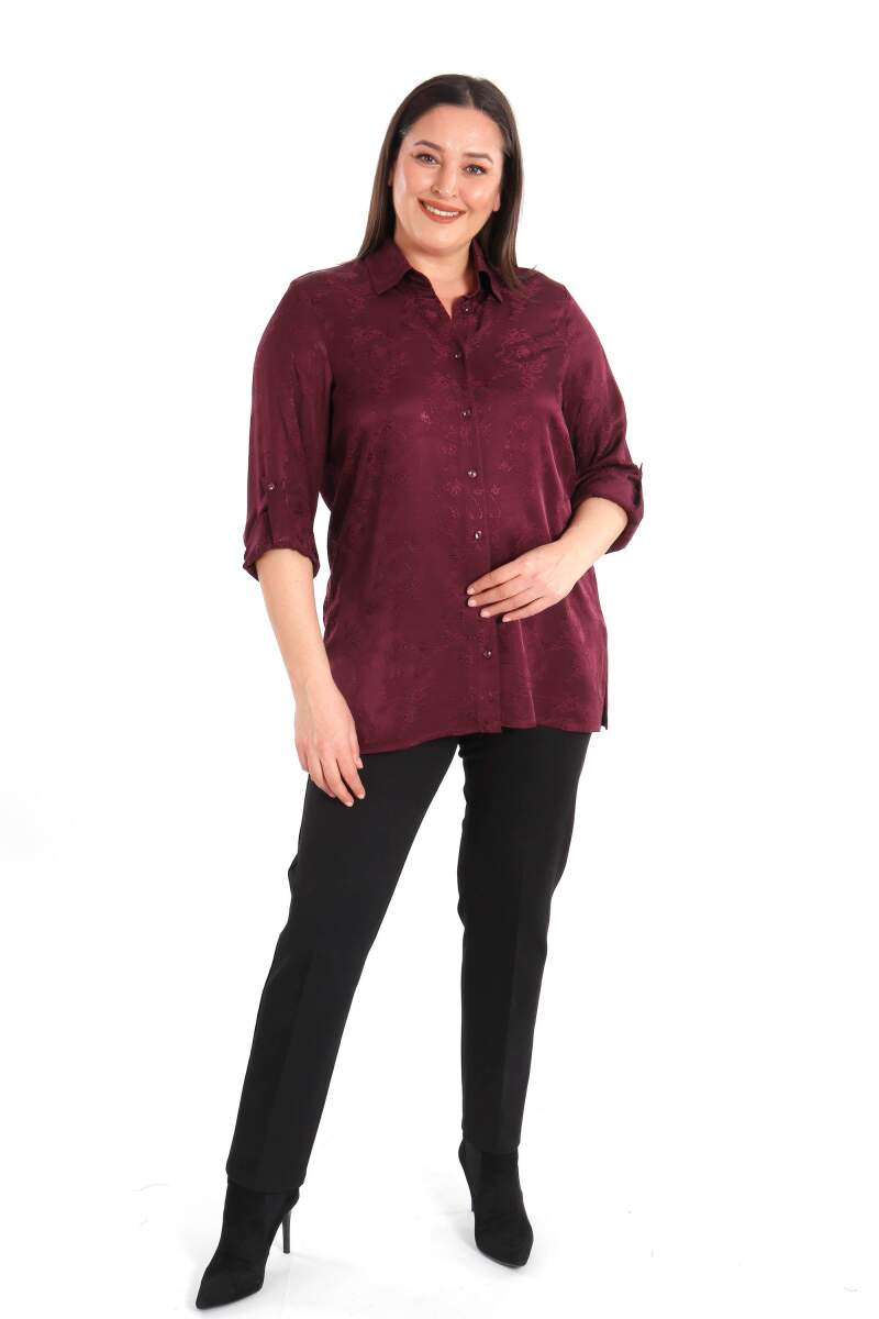 Angelino Büyük Beden Desenli Floş Viskoz Mürdüm Gömlek, sonbahar ve kış aylarının bitmeyen enerjisini desenli gömleğimiz ile yakalayın! Hoş dokusu ve cıvıl cıvıl renkleri ile seni büyüleyecek olan bu parçayı kumaş pantolonlar ile birleştirmek isteyebilirsin. Hafif dokusu ile rahatlığı hissederken en yoğun günlerin bile enerjik geçecek! :)