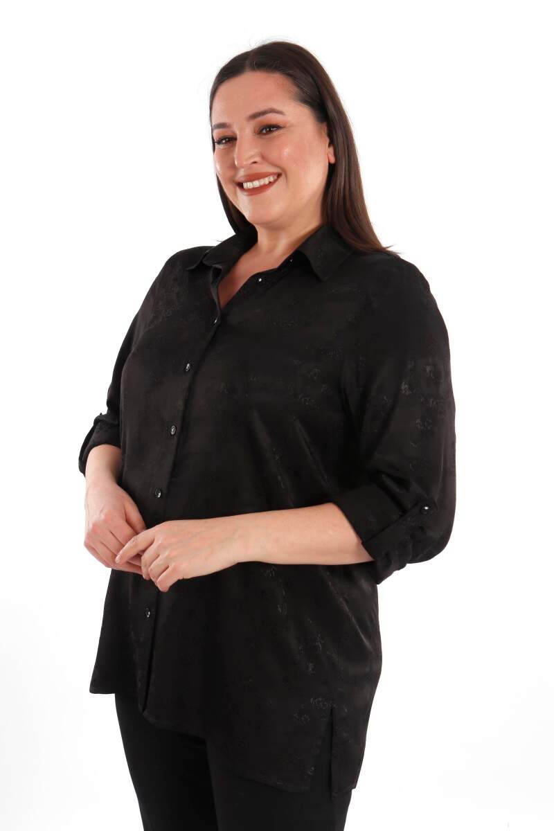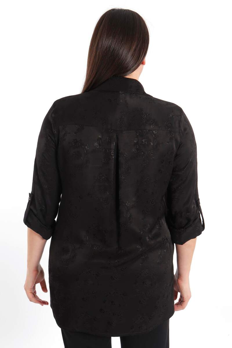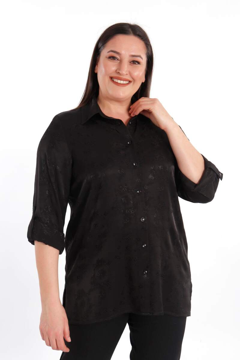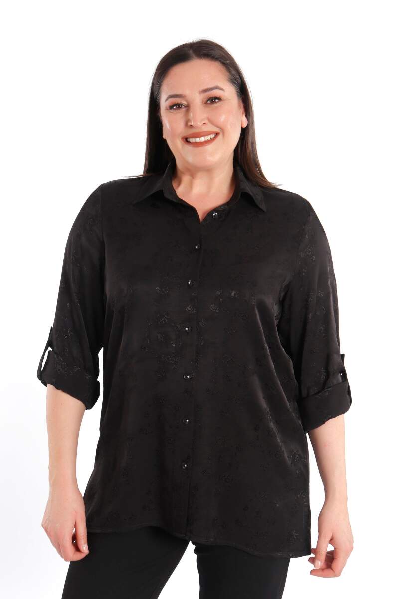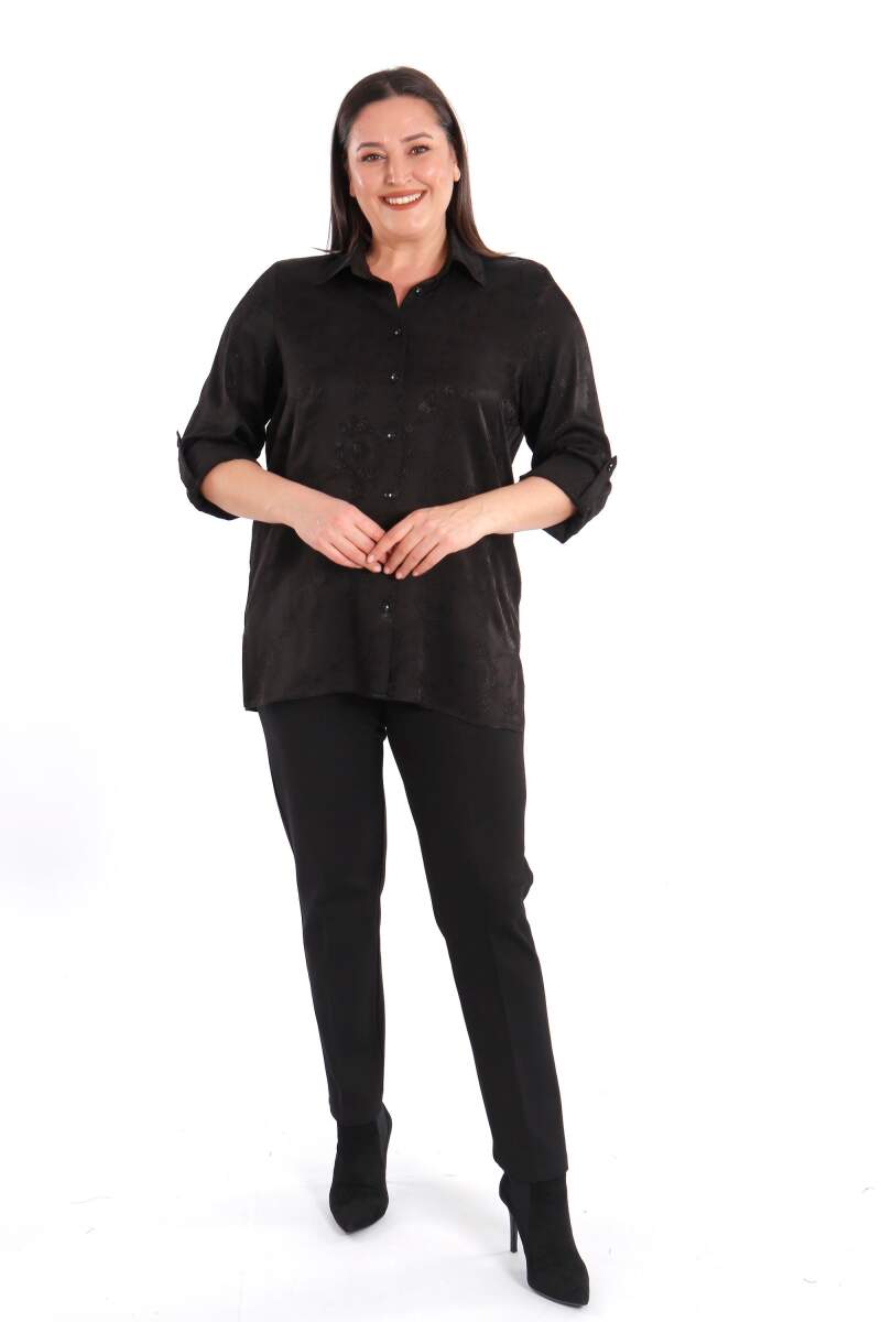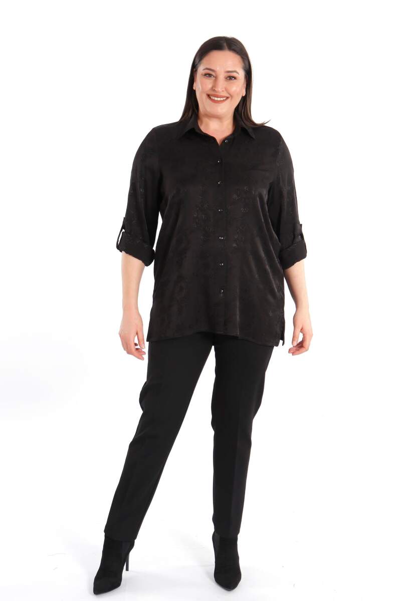 Angelino Büyük Beden Desenli Floş Viskoz Siyah Gömlek, sonbahar ve kış aylarının bitmeyen enerjisini desenli gömleğimiz ile yakalayın! Hoş dokusu ve cıvıl cıvıl renkleri ile seni büyüleyecek olan bu parçayı kumaş pantolonlar ile birleştirmek isteyebilirsin. Hafif dokusu ile rahatlığı hissederken en yoğun günlerin bile enerjik geçecek! :)