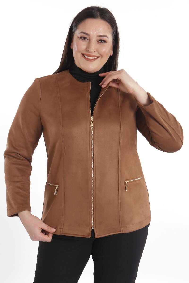 Büyük Beden Fermuarlı Süet Taba Ceket Ürün Özellikleri: Hafif, yumuşak ve esnek dokuya sahip Rahat form düz kesim Açılır kapanır fermuar detayı ile şık tasarım Kalça üstü boy bisiklet yaka Ürün Açıklaması: Süet malzemeden üretilen, yumuşak dokusu ile dikkat çeken süet ceket, rahatlığı ile günlük yaşamın ve özel günlerin ayrılmaz parçası; Süs fermuar detay ile şık bir tasarım; Bluz, gömlek, pantolon ve eteklerinizle rahatlıkla kombinleyebileceğiniz fermuarlı taba süet ceket; Renk: Taba Malzeme: Ön %95 Polyester %5 Elastan Ölçüler: Manken Ölçüleri:Omuz:47 cm; Göğüs:97 cm; Basen:105cm; Bel:80 cm; Boy:1,79 cm Ürün boyu 70 cm'dir; Model Bedeni:44;