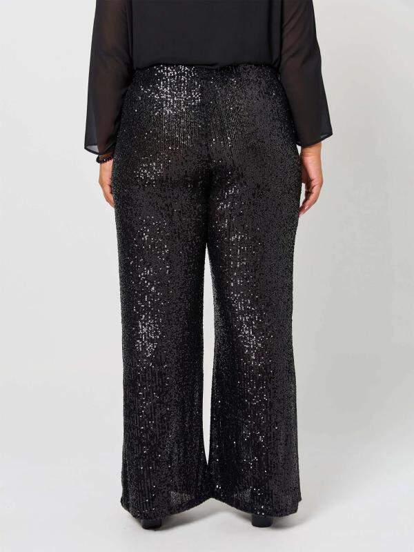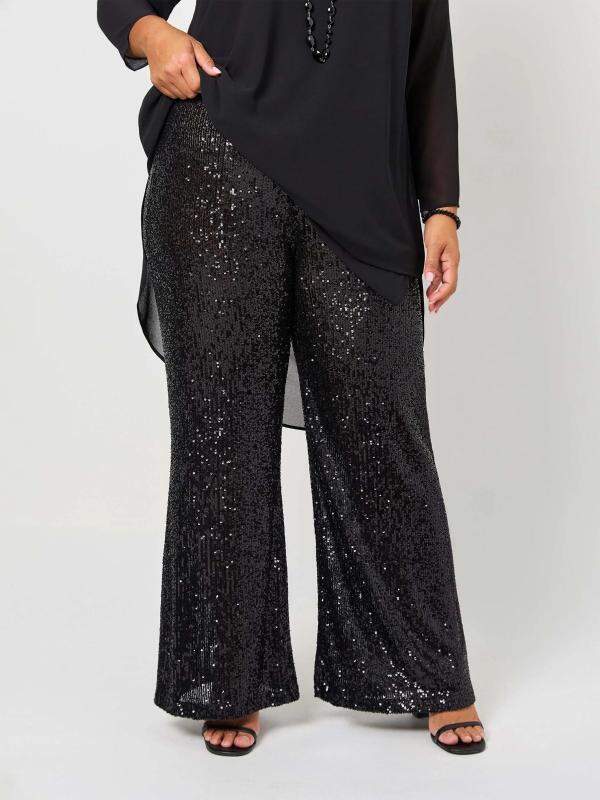 Işıltılı şıklığı konforla buluşturan büyük beden payet siyah pantolon, gece davetlerinden özel organizasyonlara kadar iddialı bir stil sunar. İspanyol paça kesimi sayesinde bacak boyunu daha uzun gösterirken, modern ve zarif bir siluet oluşturur.