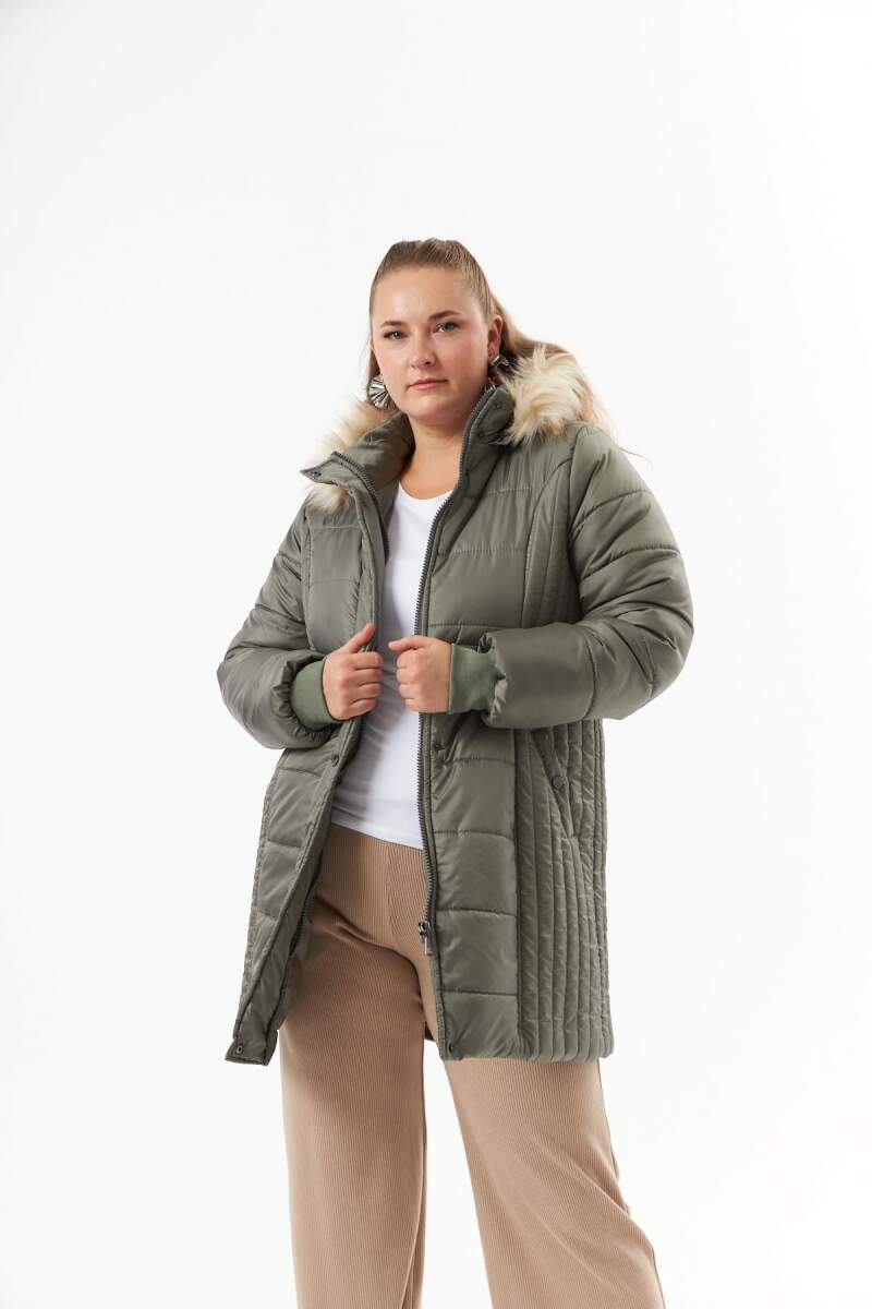Kapüşonu Kürklü ve çıkarılabilir, Fermuarlı ve çıtçıt kapamalı, Yanları cepli, Büyük Beden Kapitone mont