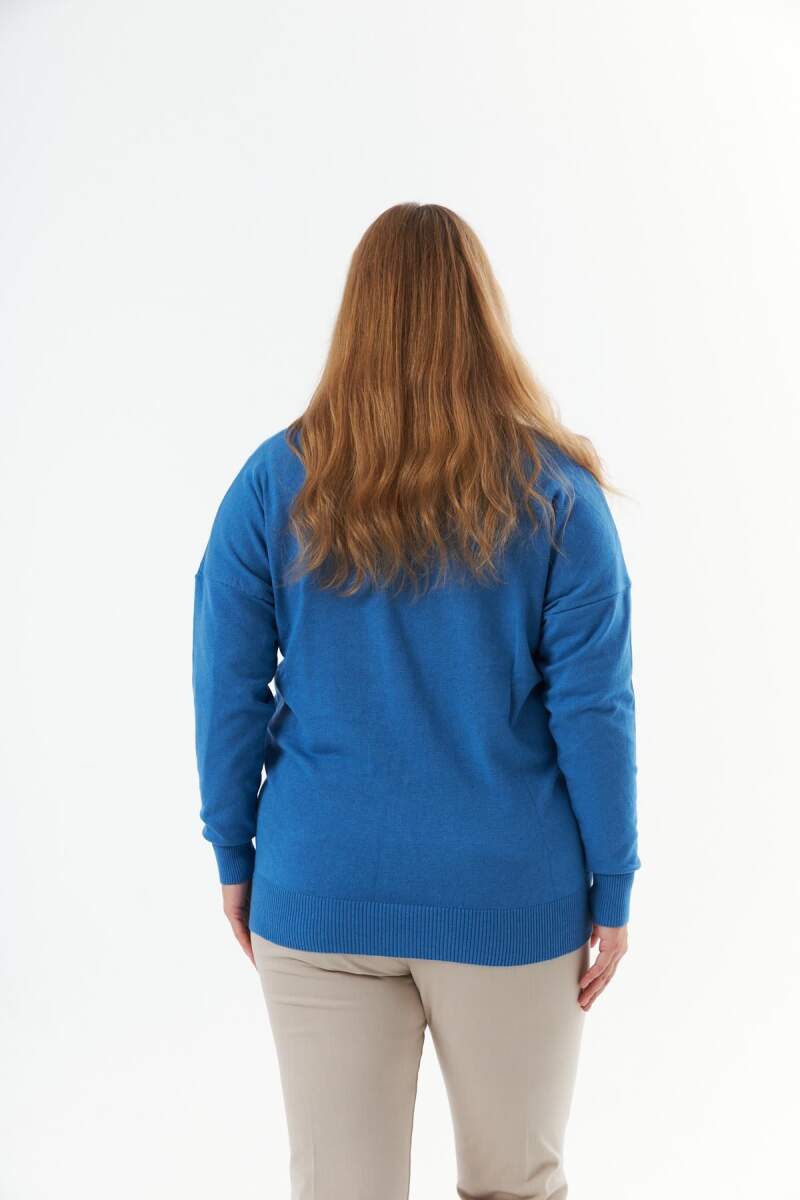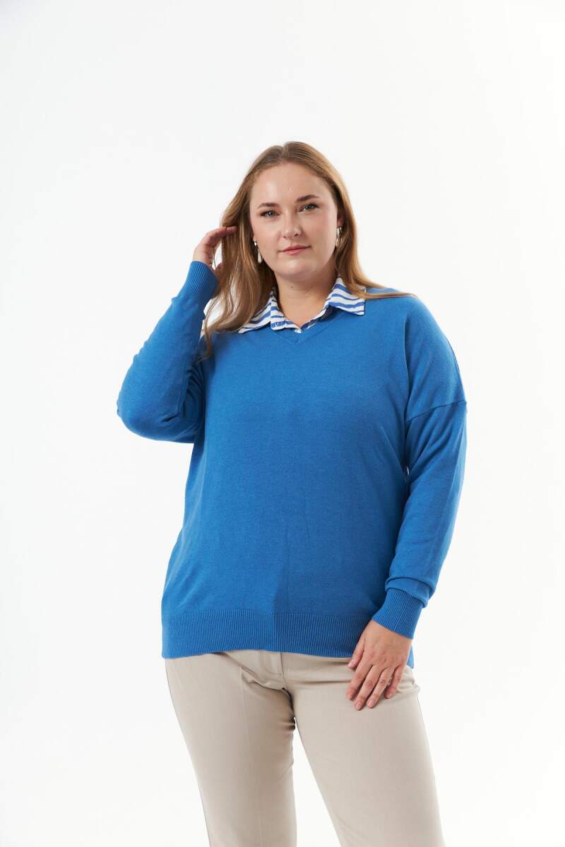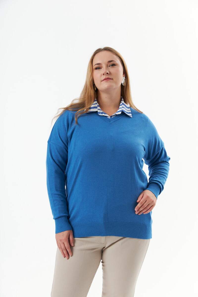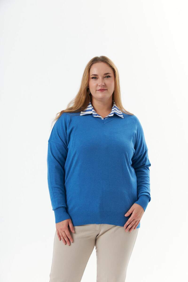 Büyük Beden Kaşmir Karışımlı V Yaka Triko Kazak İndigo