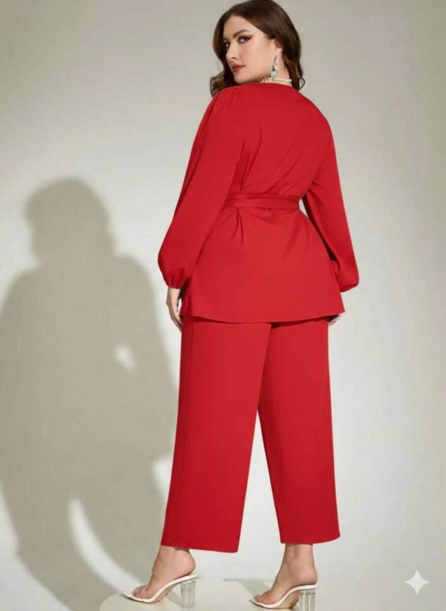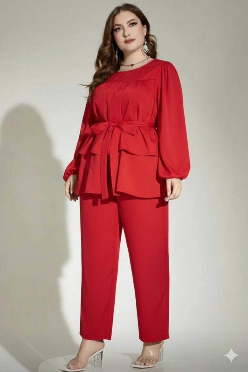 Büyük Beden Kırmızı Pantolonlu 2’li Takım, hem şık hem konforlu bir görünüm arayan kadınlar için tasarlandı. Rahat kesimi sayesinde vücuda yapışmaz, akıcı duruşuyla zarif bir siluet oluşturur.