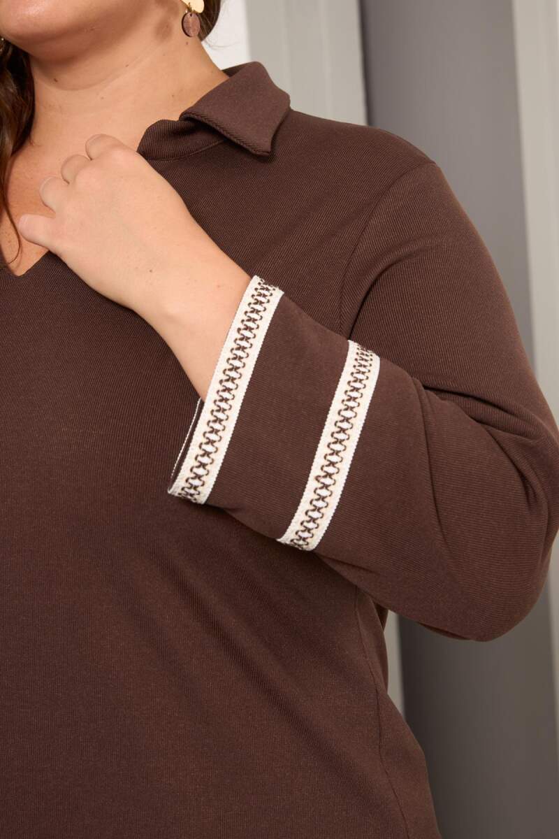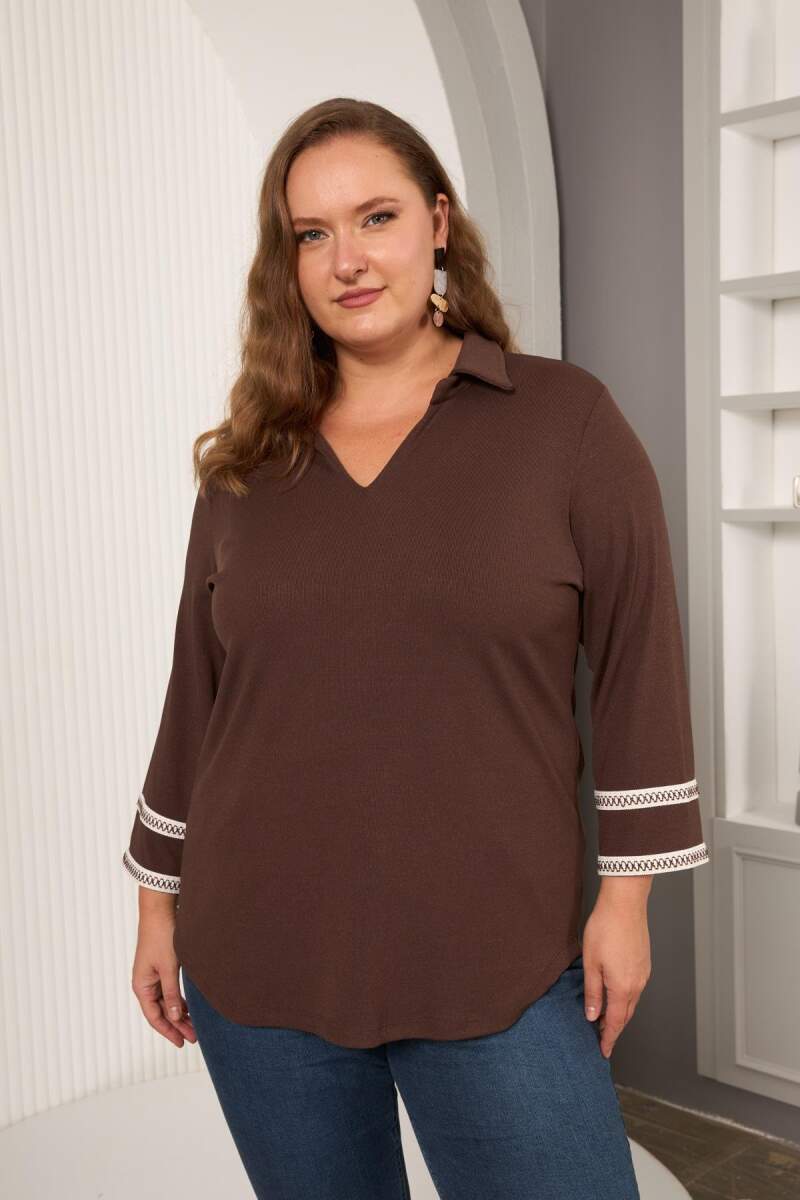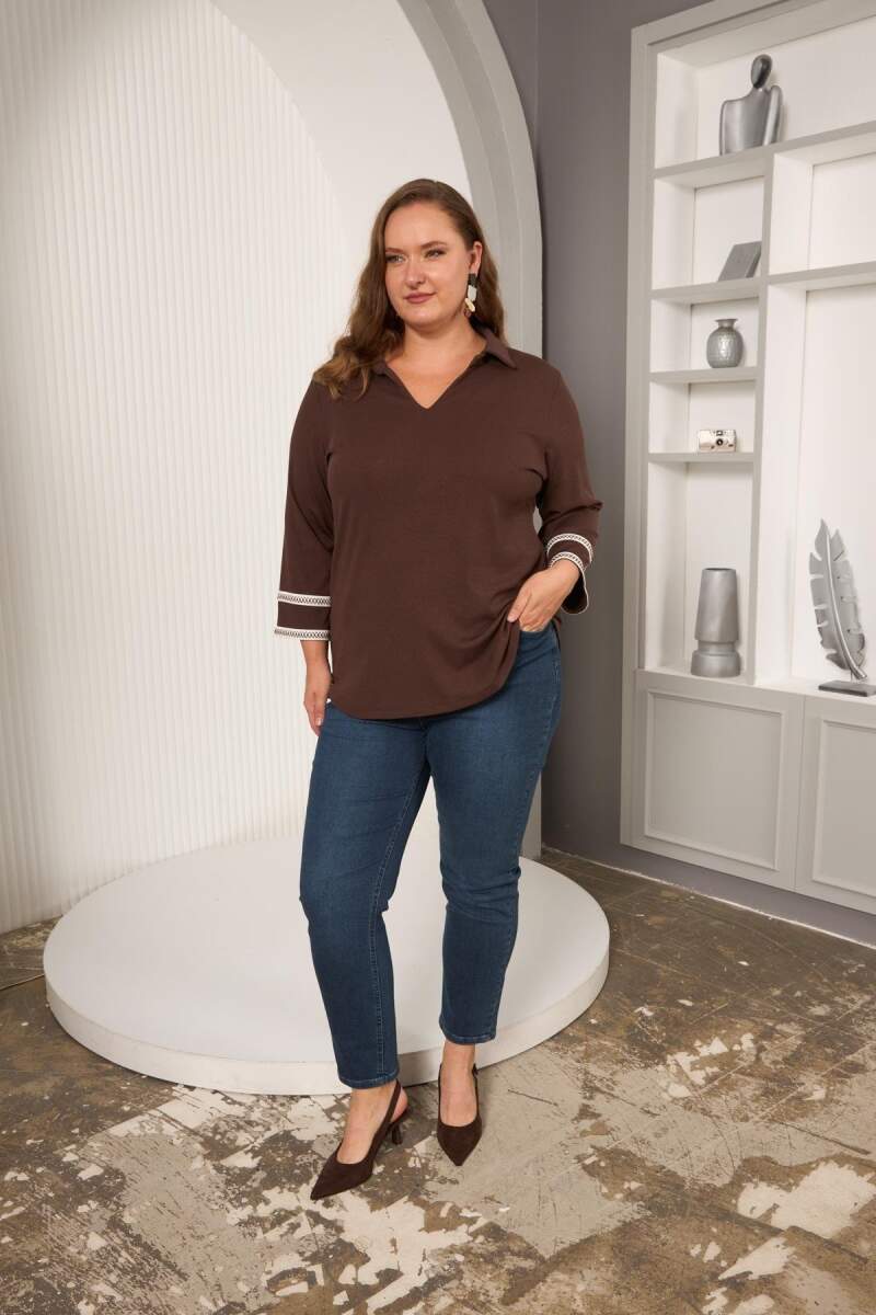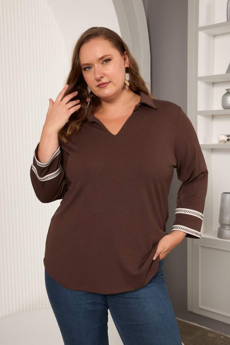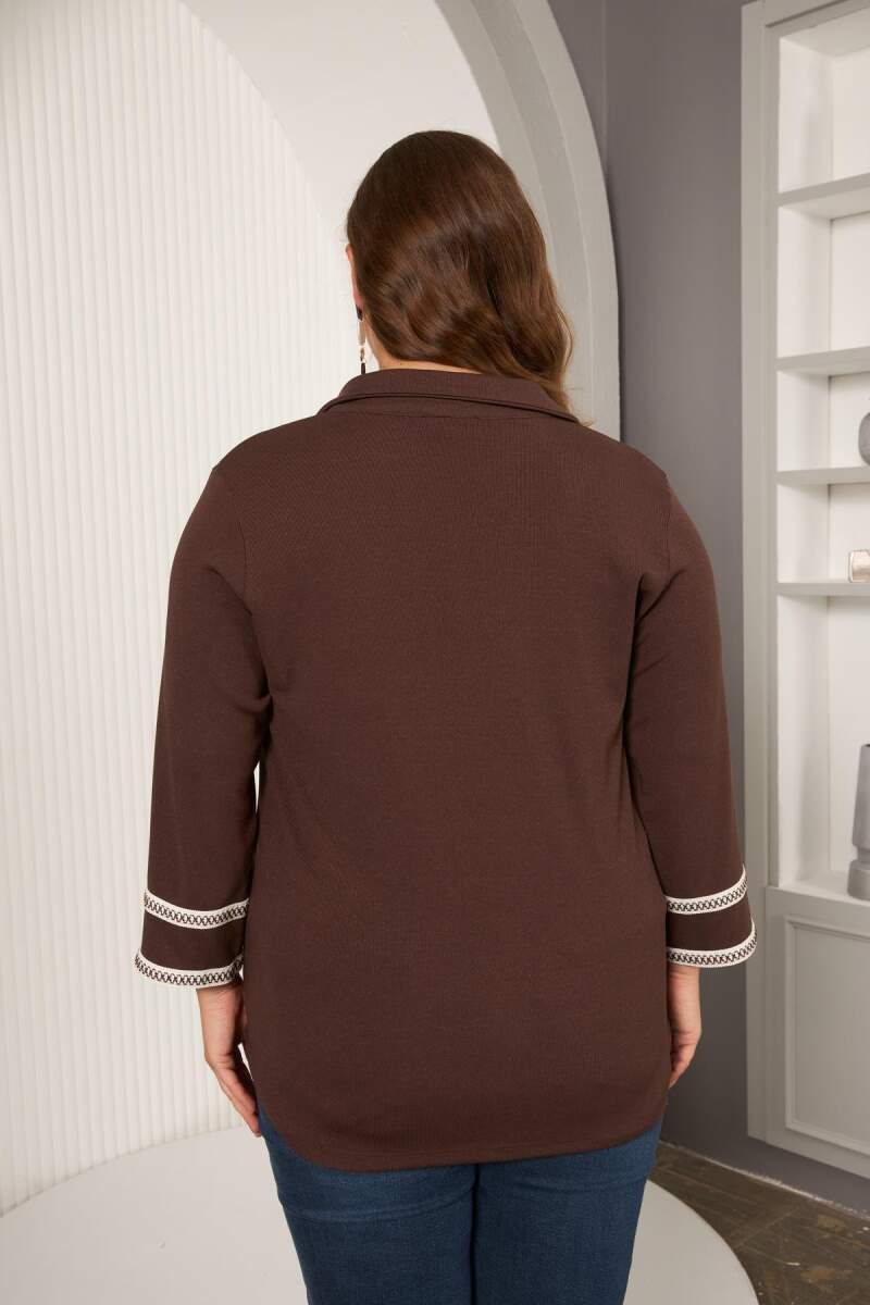 Büyük Beden Kol Nakış Detay Örme Bluz Kahverengi