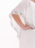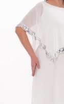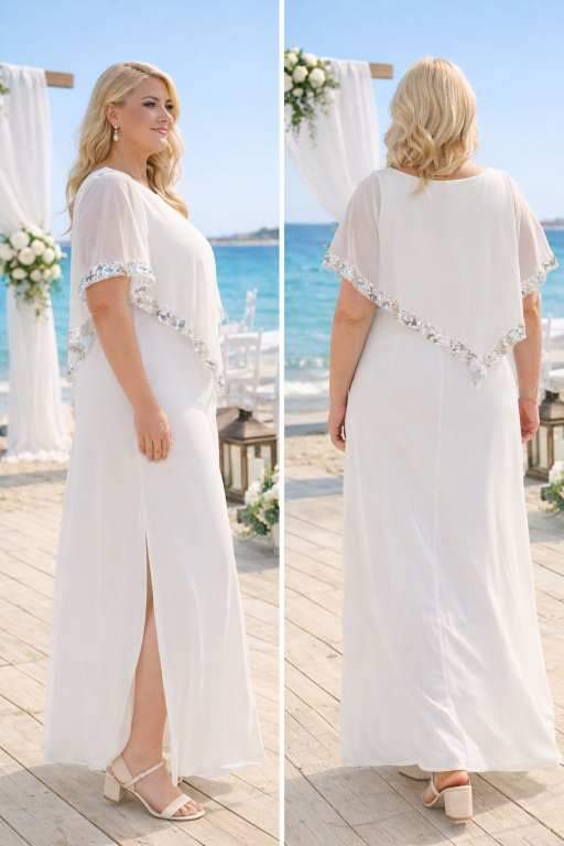 Büyük Beden Pelerin Kollu Payet Detaylı Beyaz Şifon Abiye Elbise, özellikle nikah ve dış mekan çekimleri için tasarlanmış zarif ve son derece şık bir modeldir. İç astarı esnek, yumuşak ve rahat kumaştan üretilmiştir. Üzerindeki şifon pelerin formu bol, dökümlü ve akışkan duruşu ile hem kusurları örter hem de çok zarif bir siluet oluşturur. Yaka kenarlarında yer alan gümüş payet detayları elbiseye ışıltılı ve zengin bir görünüm kazandırır.