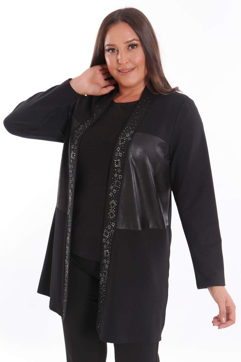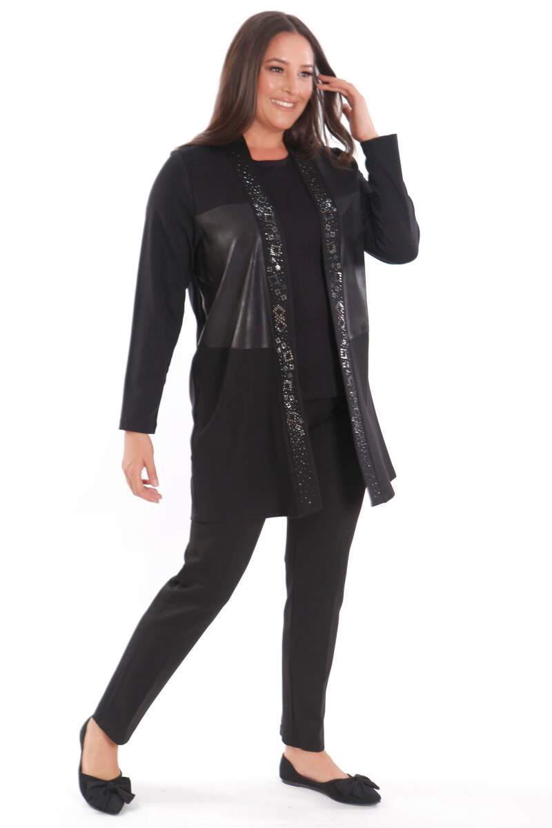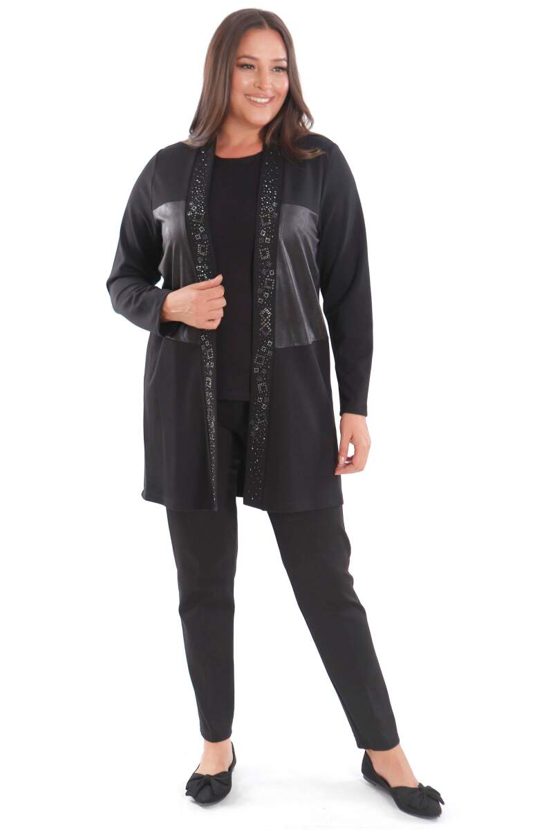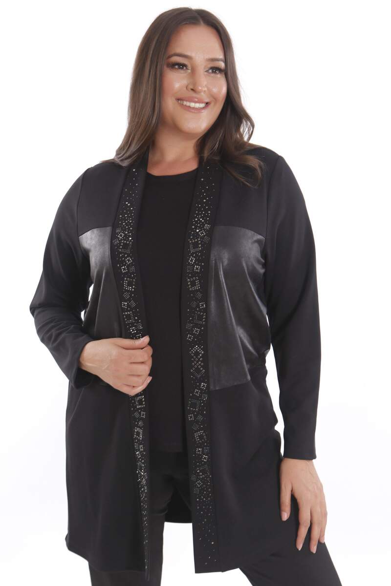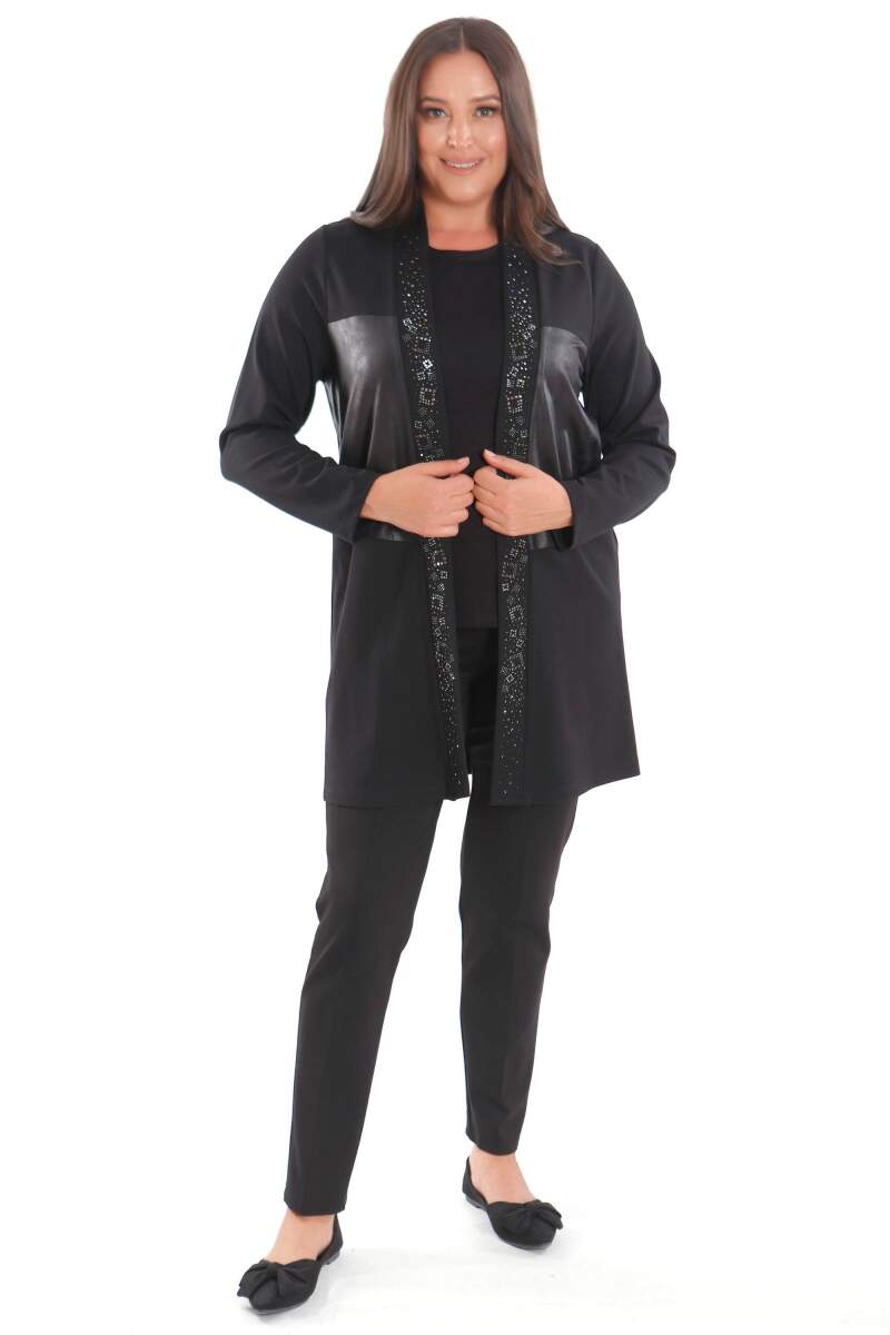 Büyük Beden Ön Deri Parçalı Taş Baskılı Siyah Hırka, tasarımda kullandığı yumuşak doku ile uzun süreli kullanımda konfor sunuyor. Kıyafetlerinizi ve şıklığınızı olumsuz hava şartlarında korurken aynı zamanda tamamlayan özel parçalardan birisi olan hırka modeli sahip olduğu rahat kalıbı ile şık bir görünüm sunuyor.