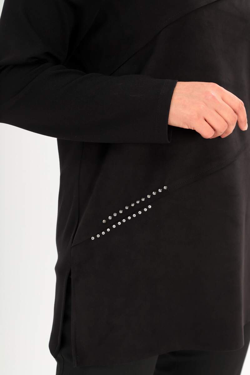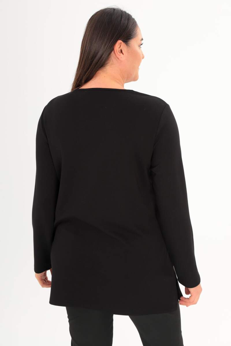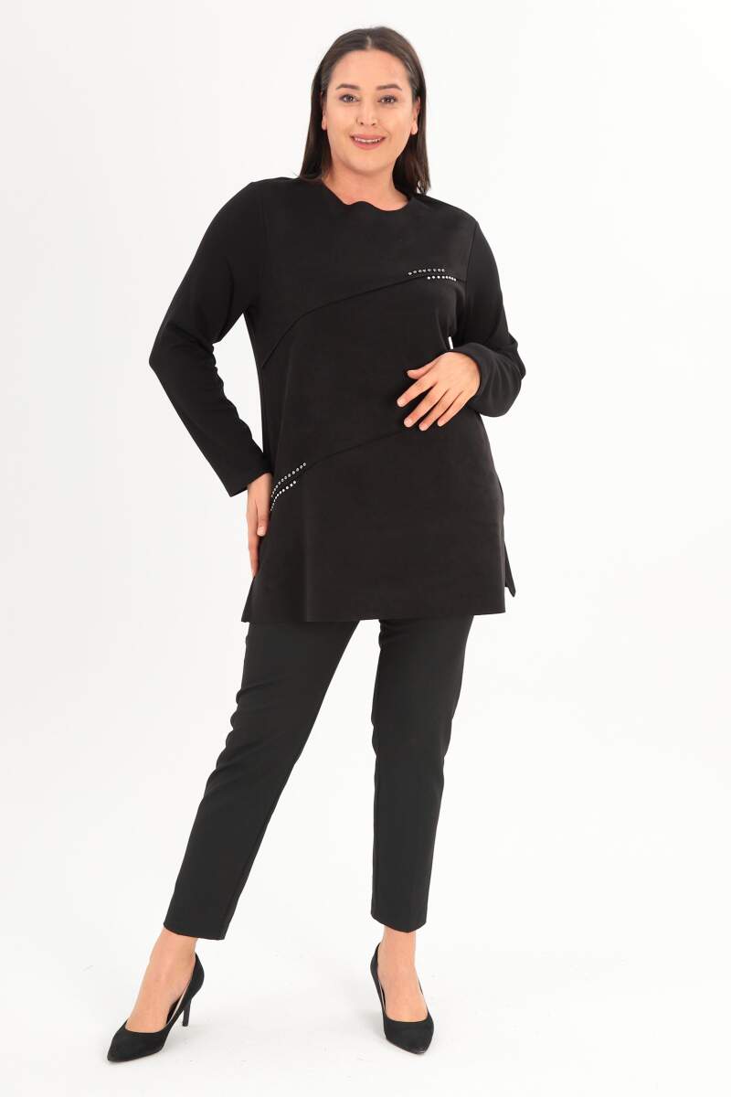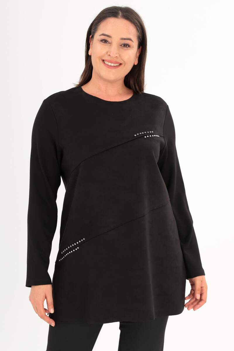 Büyük Beden Ön Süet Trok Baskılı Siyah Tunik