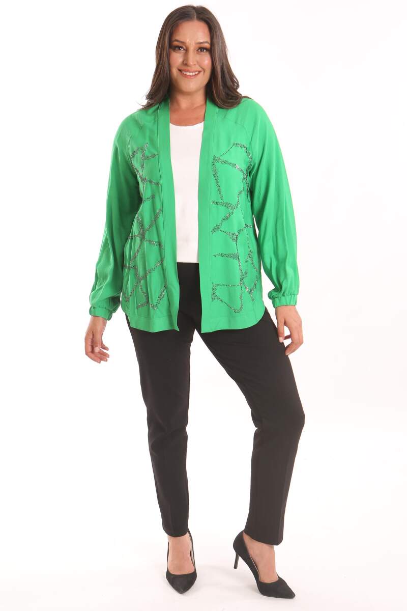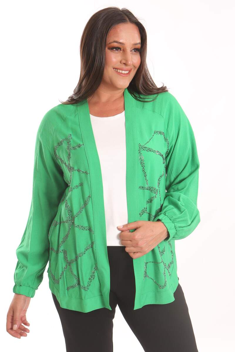 Angelino Büyük Beden Ön Taş Baskılı Yeşil Ceket, klasik kesimi yuvarlak yaka detayı ve dokusu ile maskülen tavrı vurgulamanıza yardımcı oluyor. Ceket modelinin ön taş detayı çarpıcı bir görünüm yaratıyor.
